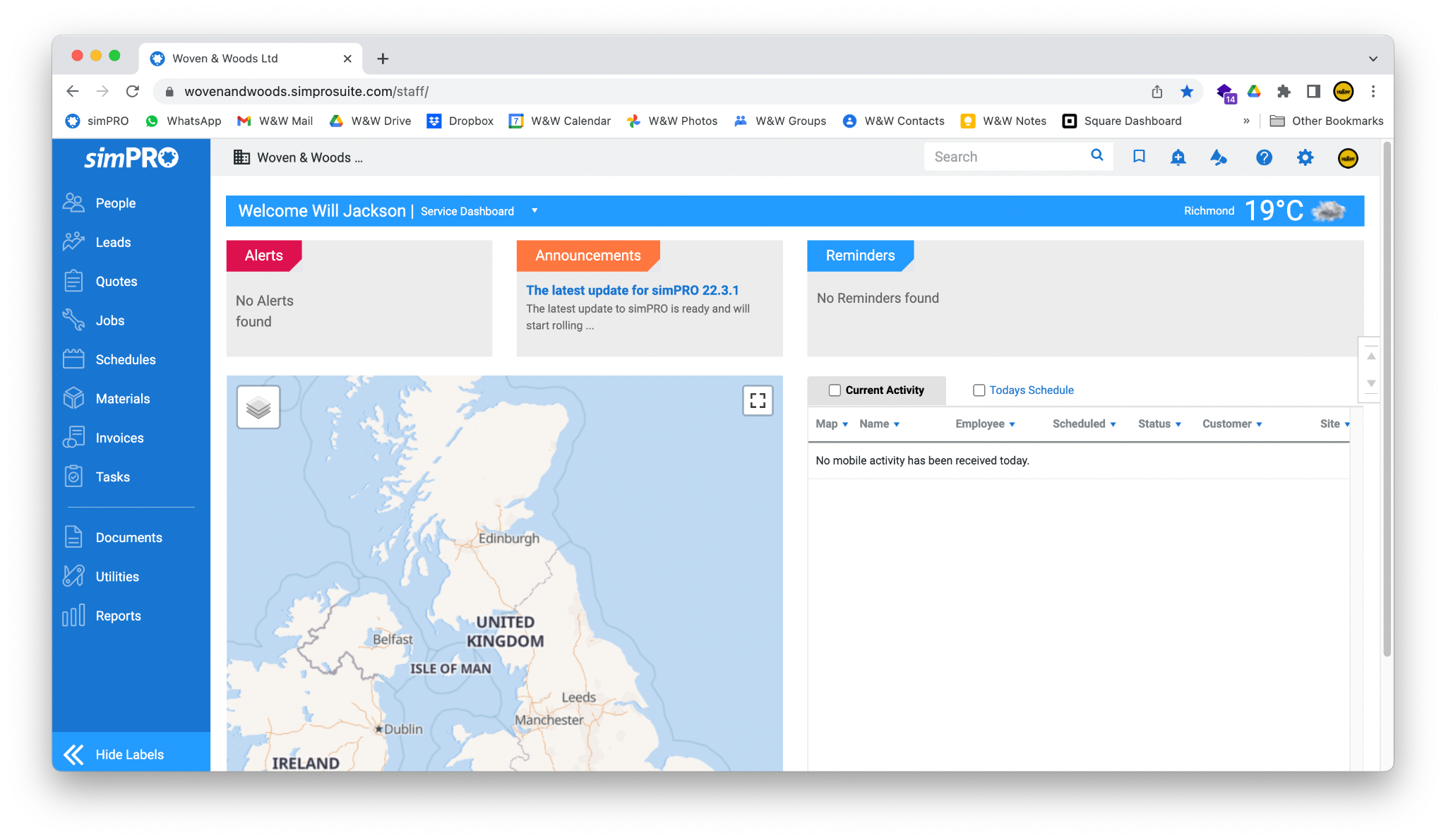 - After logging in, you will see the main simPRO dashboard (this may vary depending on your account setup).