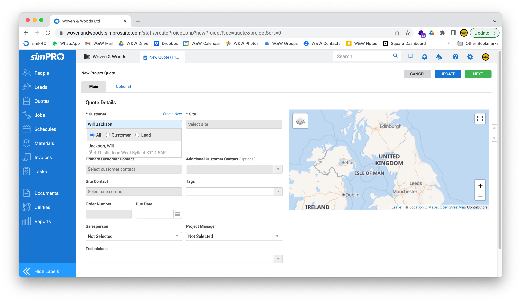 Section titled “Customer”- If the quote is for an existing customer, start typing their name into the Customer field to search. Click their name when it appears to pull through their details.