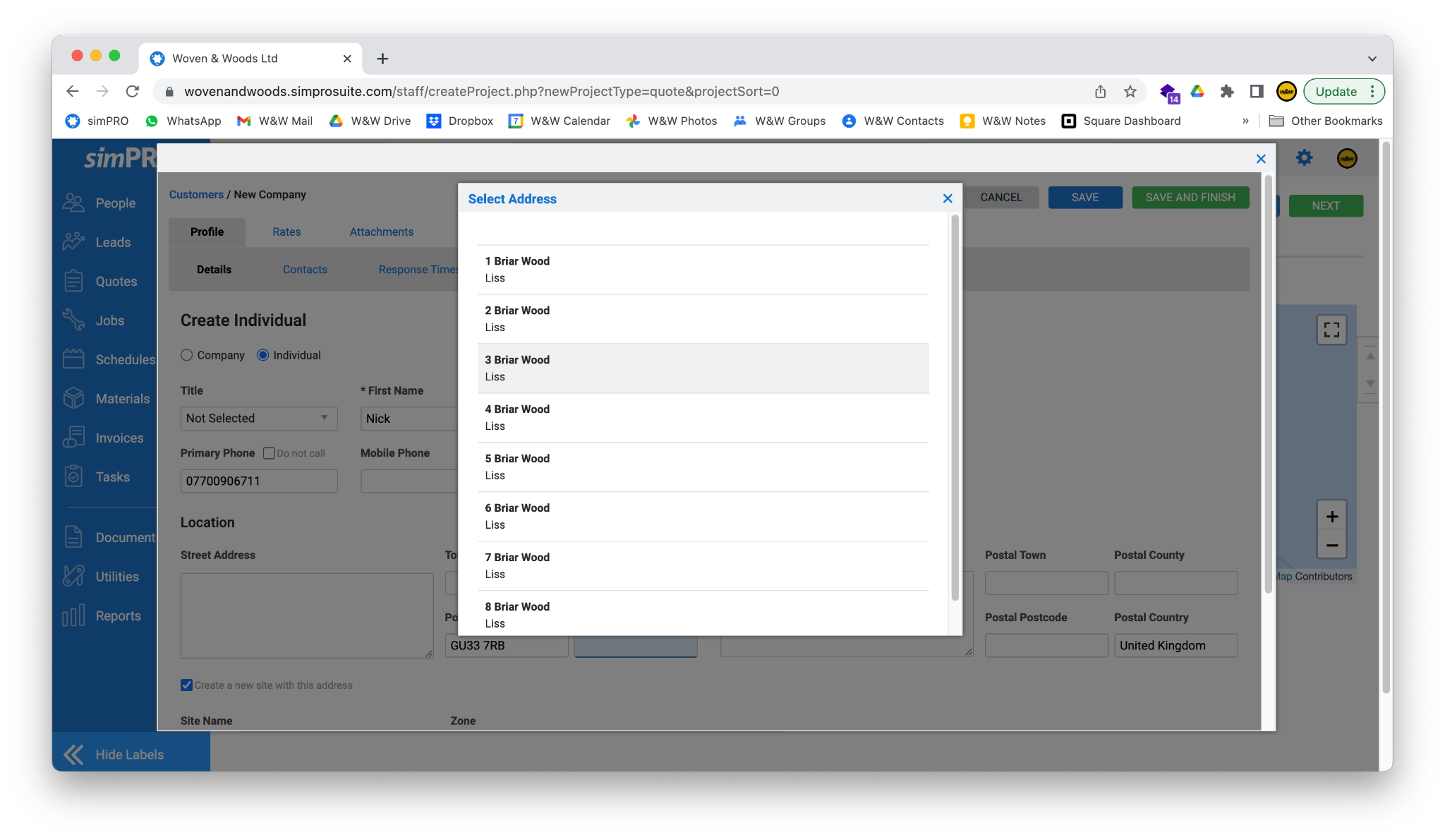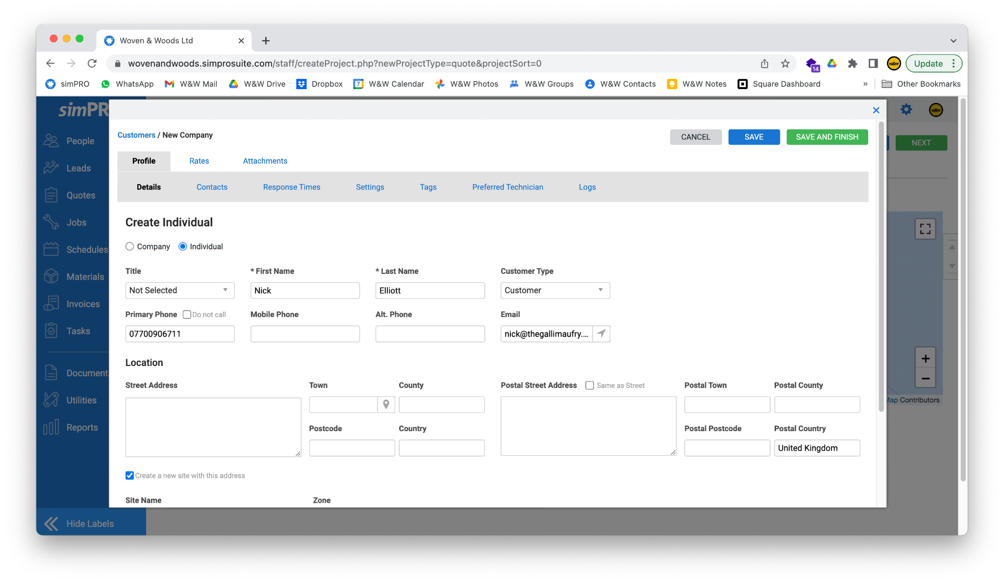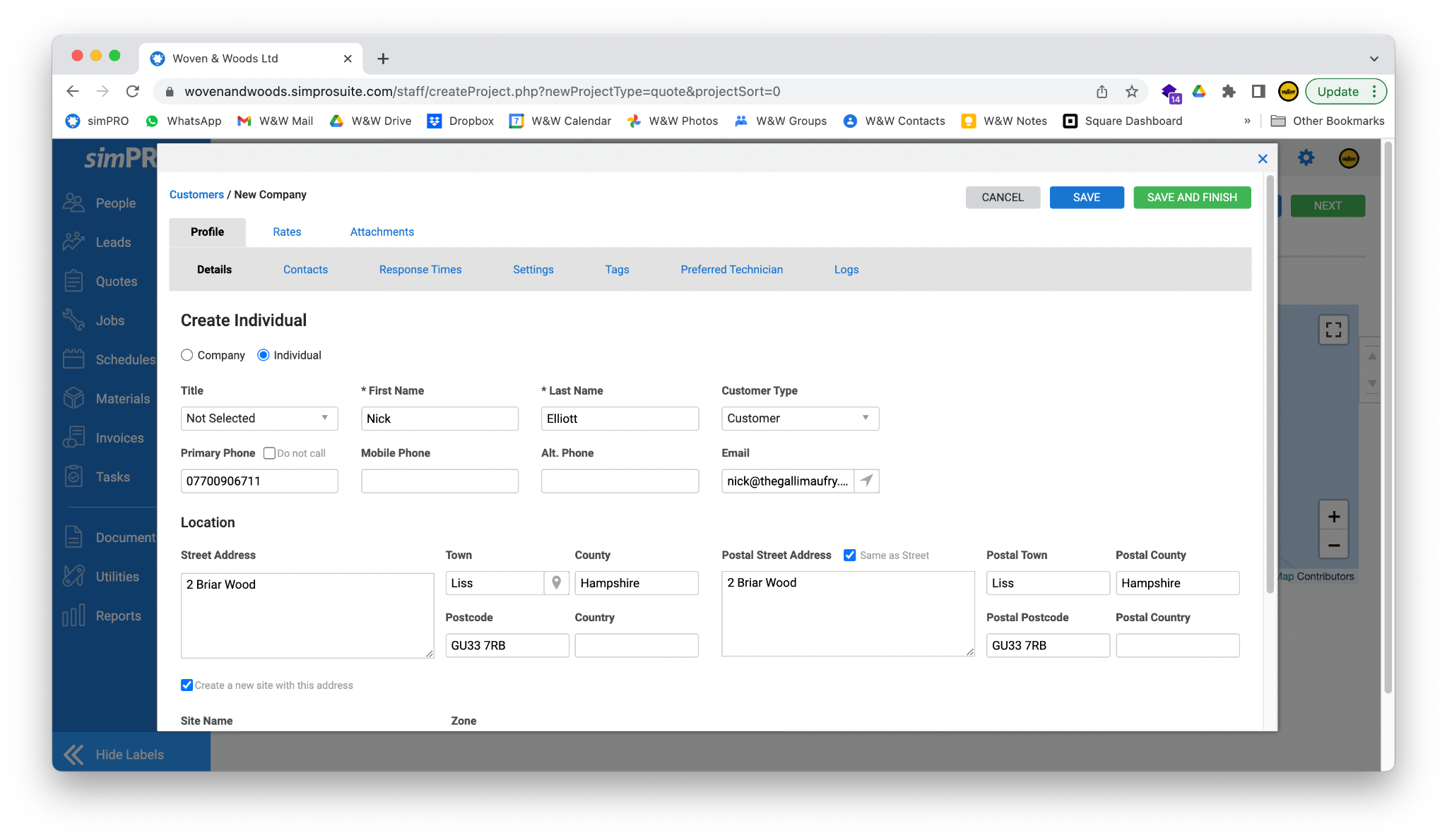 - Click the Save and Finish button in the top right of the screen to save the customer and return to the New Quote screen.