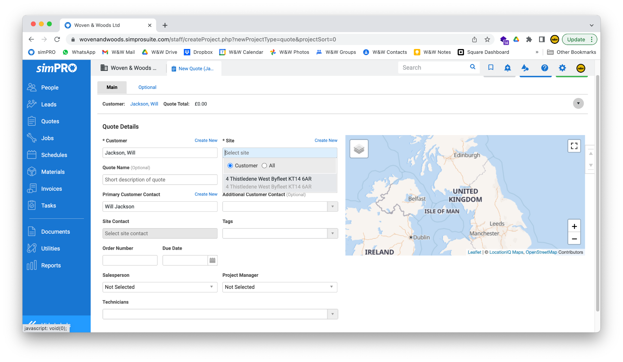 - Click on the Site field. A dropdown box should appear with the customer’s address. If you have set up the customer correctly (or they already existed), you should be able to simply select the address, and the details will be filled in for you.