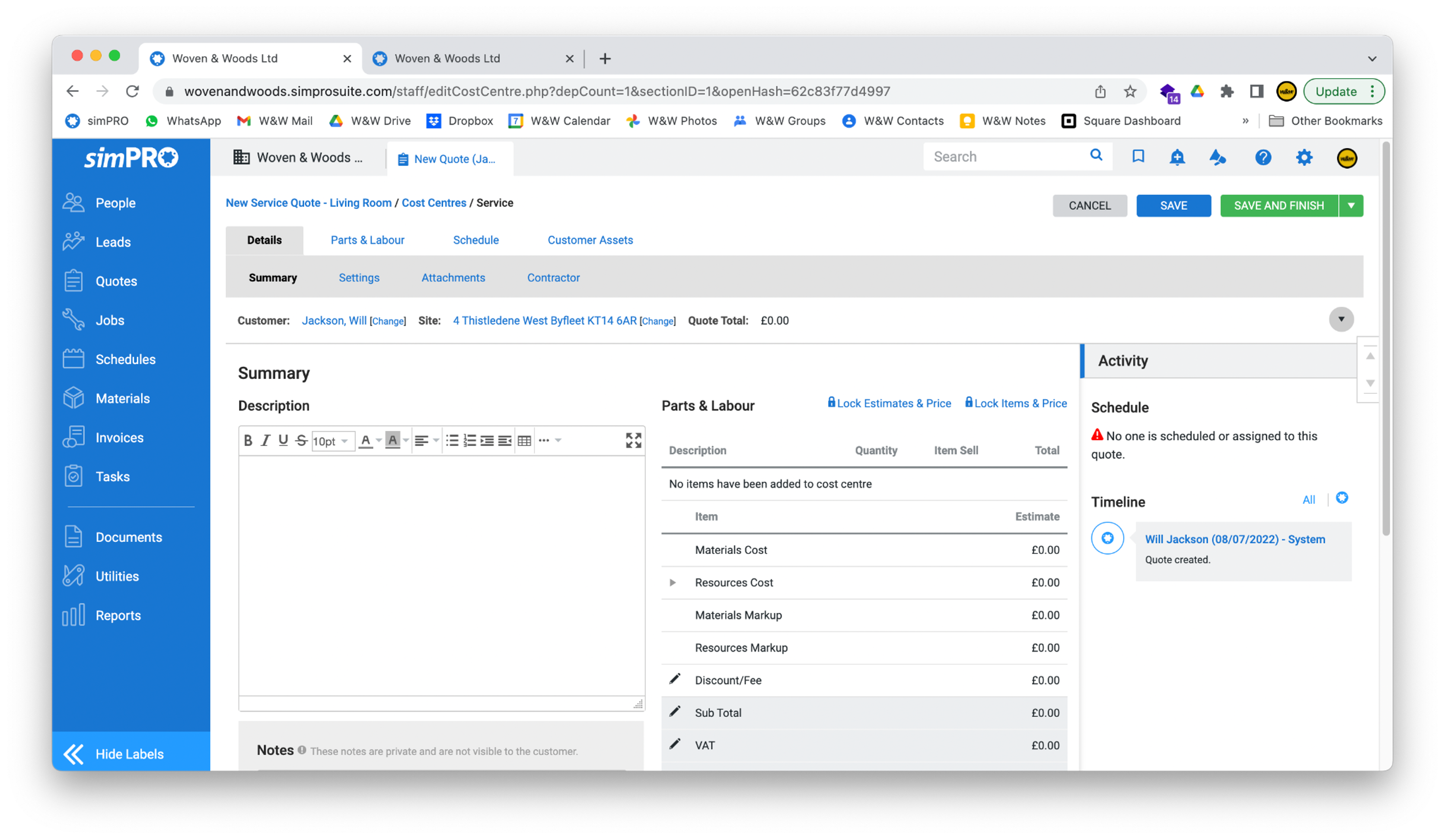 Section titled “Build the Quote”- simPRO should redirect you to the main page for your new quote, which will look like the screenshot below.