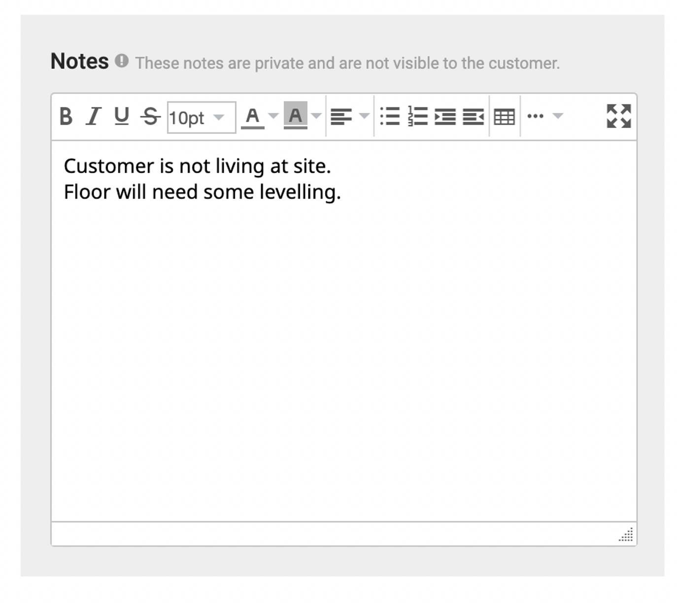 - Any notes about the job can be entered into the Notes field at the bottom of the screen. These notes are only viewable by other staff members, not the customer. It’s important to include all relevant information so anyone looking at this job in the future is aware.