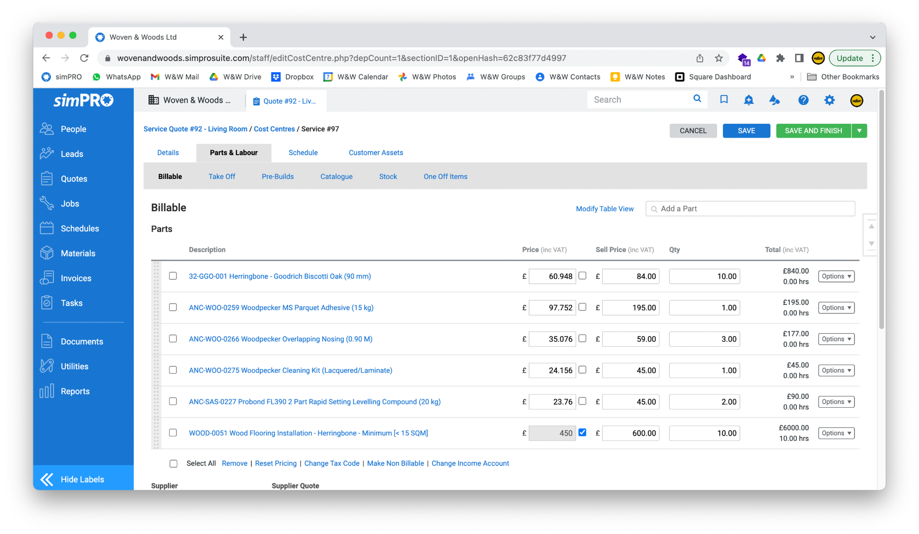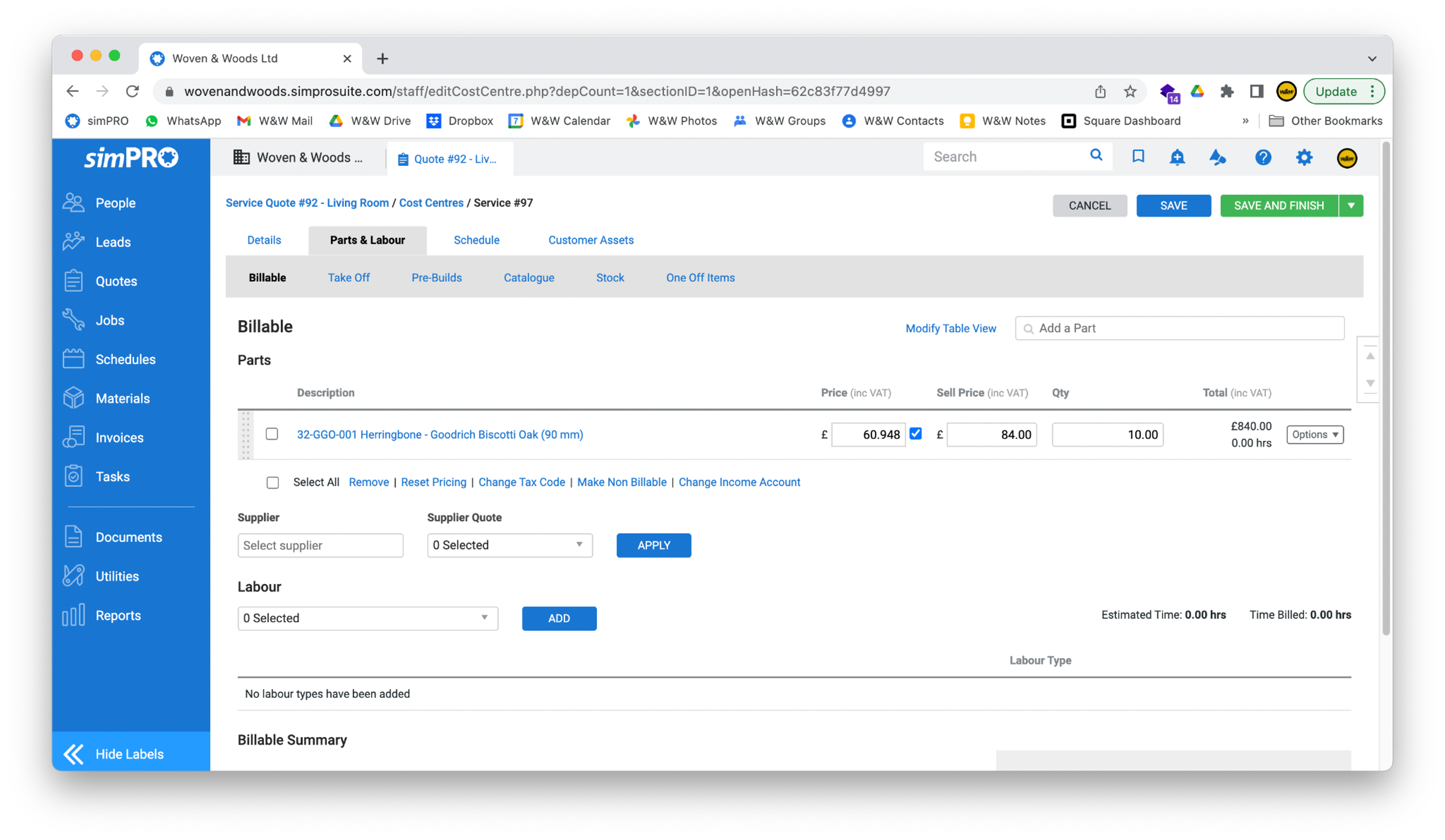 - Unlike normal items, you won’t see the labour item added immediately. To see all items added to the quote (or to delete a labour item), click the Billable button in the bar at the top of the page.