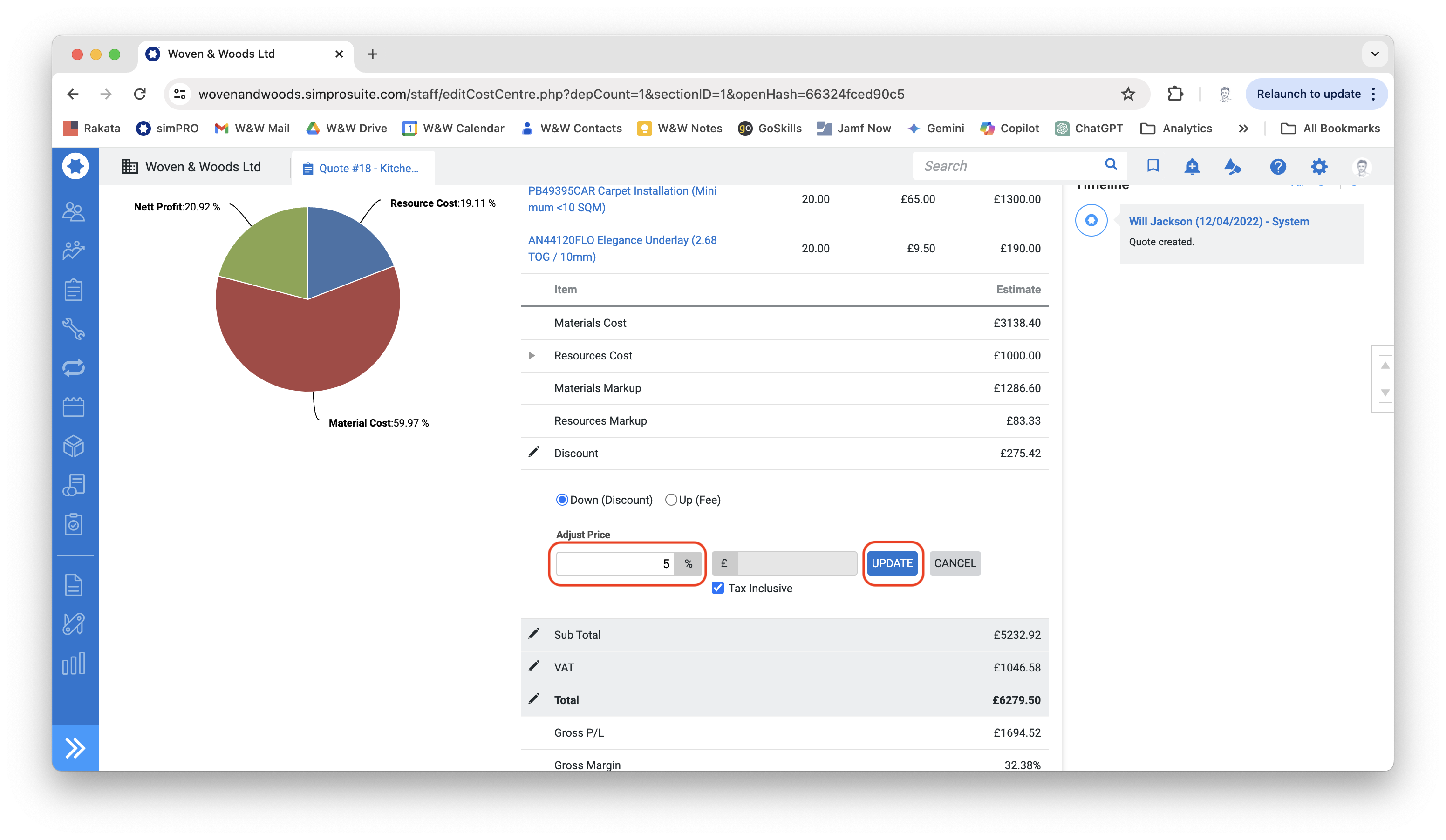 To apply a discount, click into the cost centre and scroll down to the item labelled Discount/Fee. Enter the discount amount and click Update.