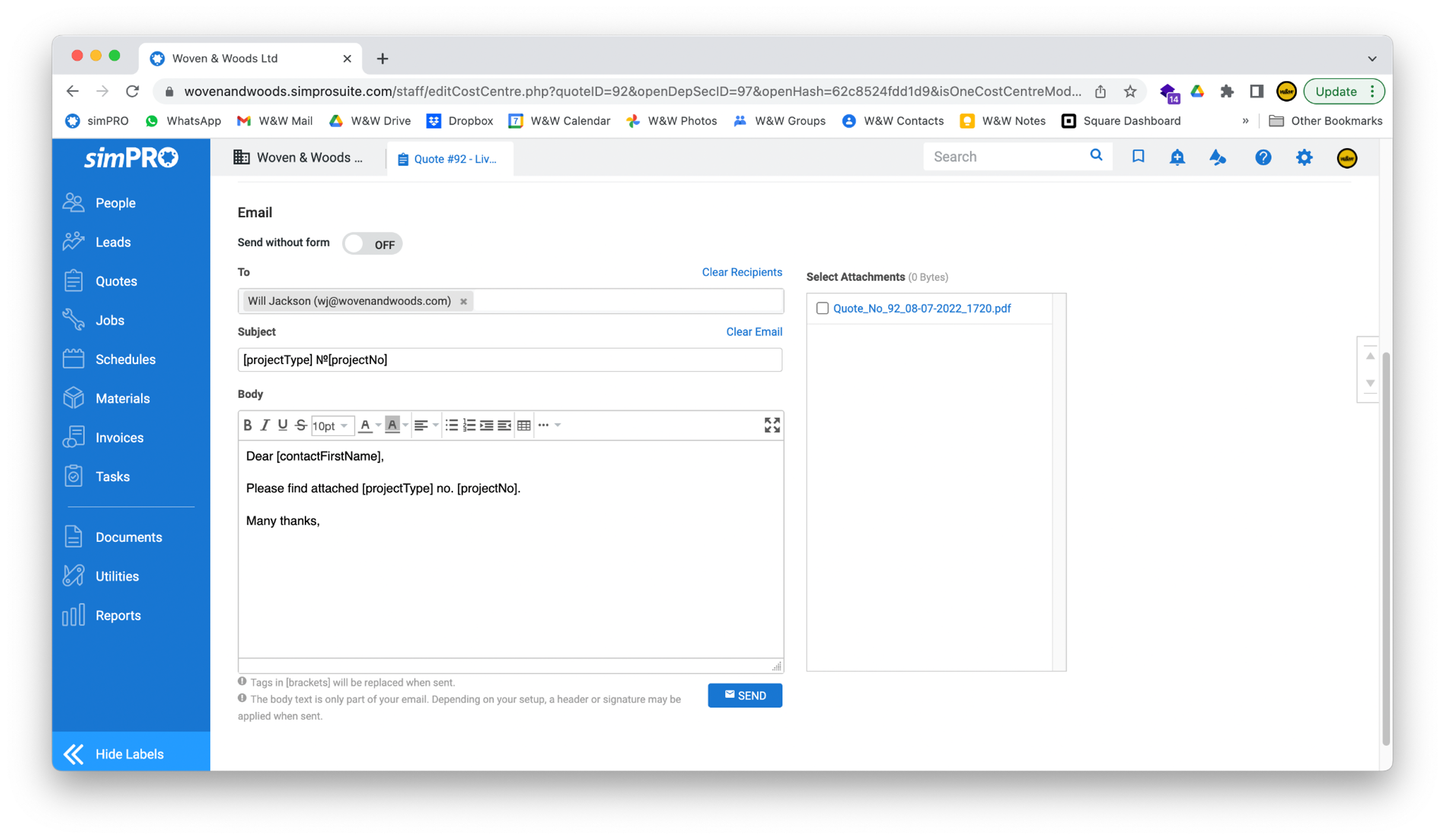 [square brackets]will be replaced when the email is sent. - When you are happy with the quote and email, click the blue Send button to send it. Copies will be sent to the customer and to your own email address for your records.