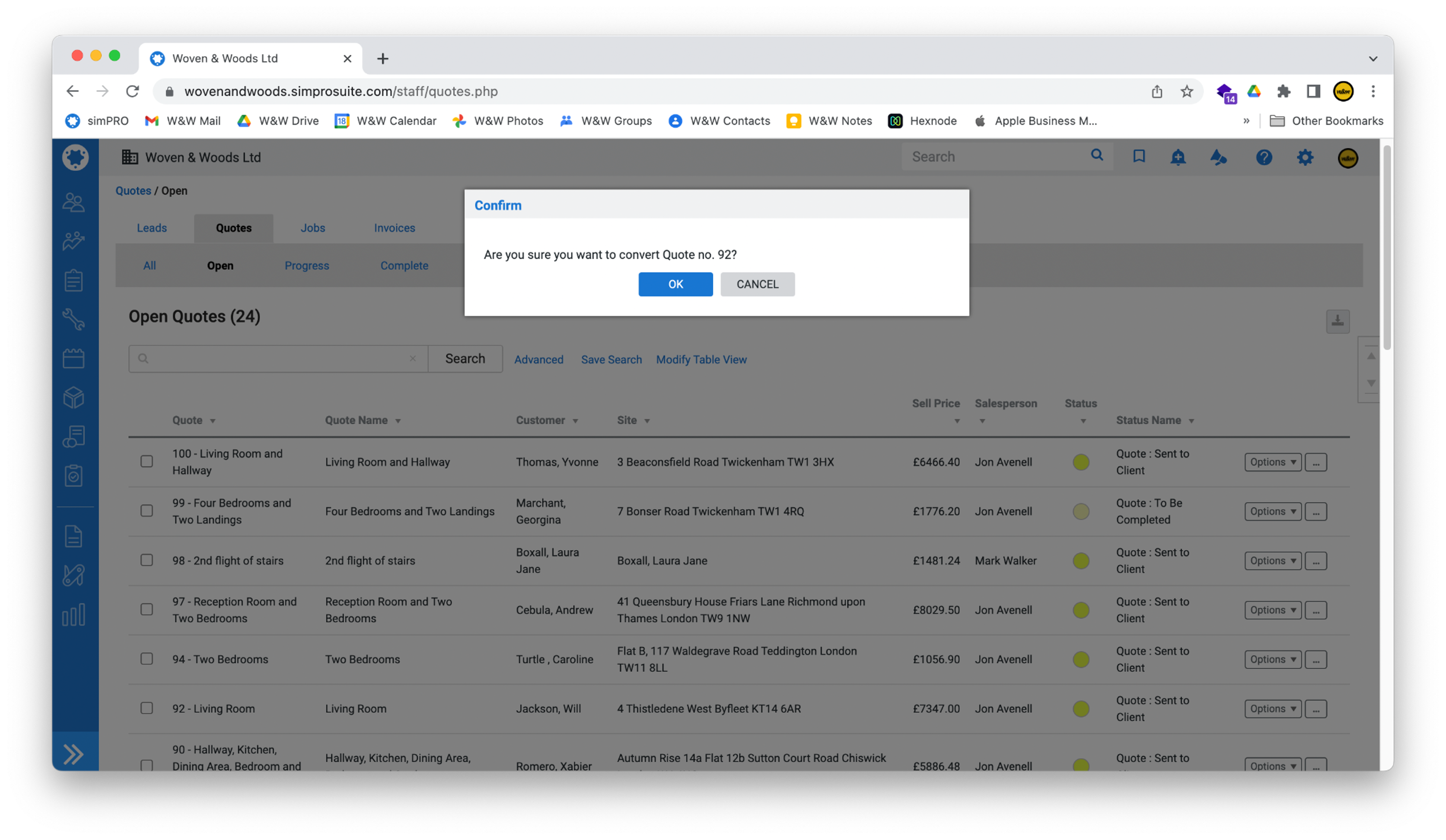 Section titled “Convert a Quote to a Job”- To convert a quote to a job, use the blue bar on the left-hand side of the screen to navigate to Quotes > Open Quotes.