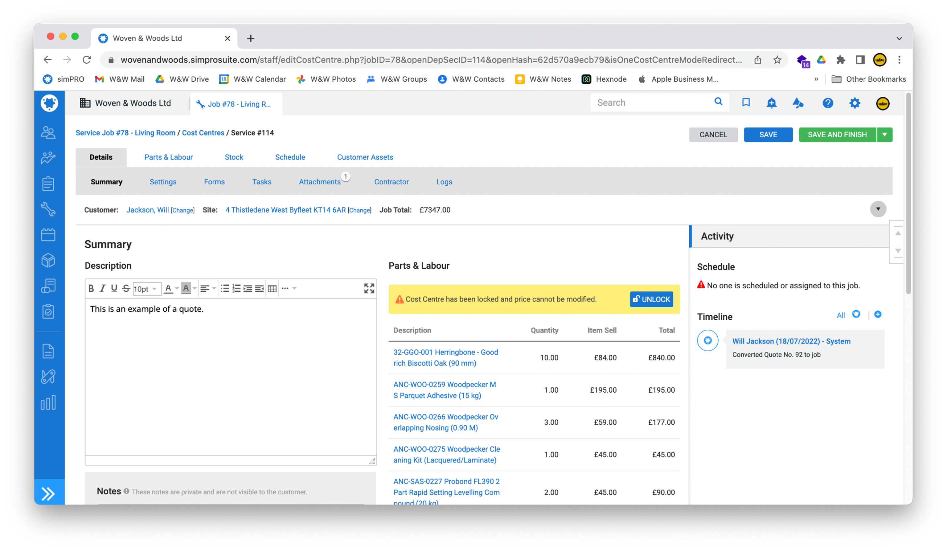 - When simPRO has finished the conversion, you will be taken to the new Job page. Click Save and Finish in the top-right of the screen to return to the list of current jobs.