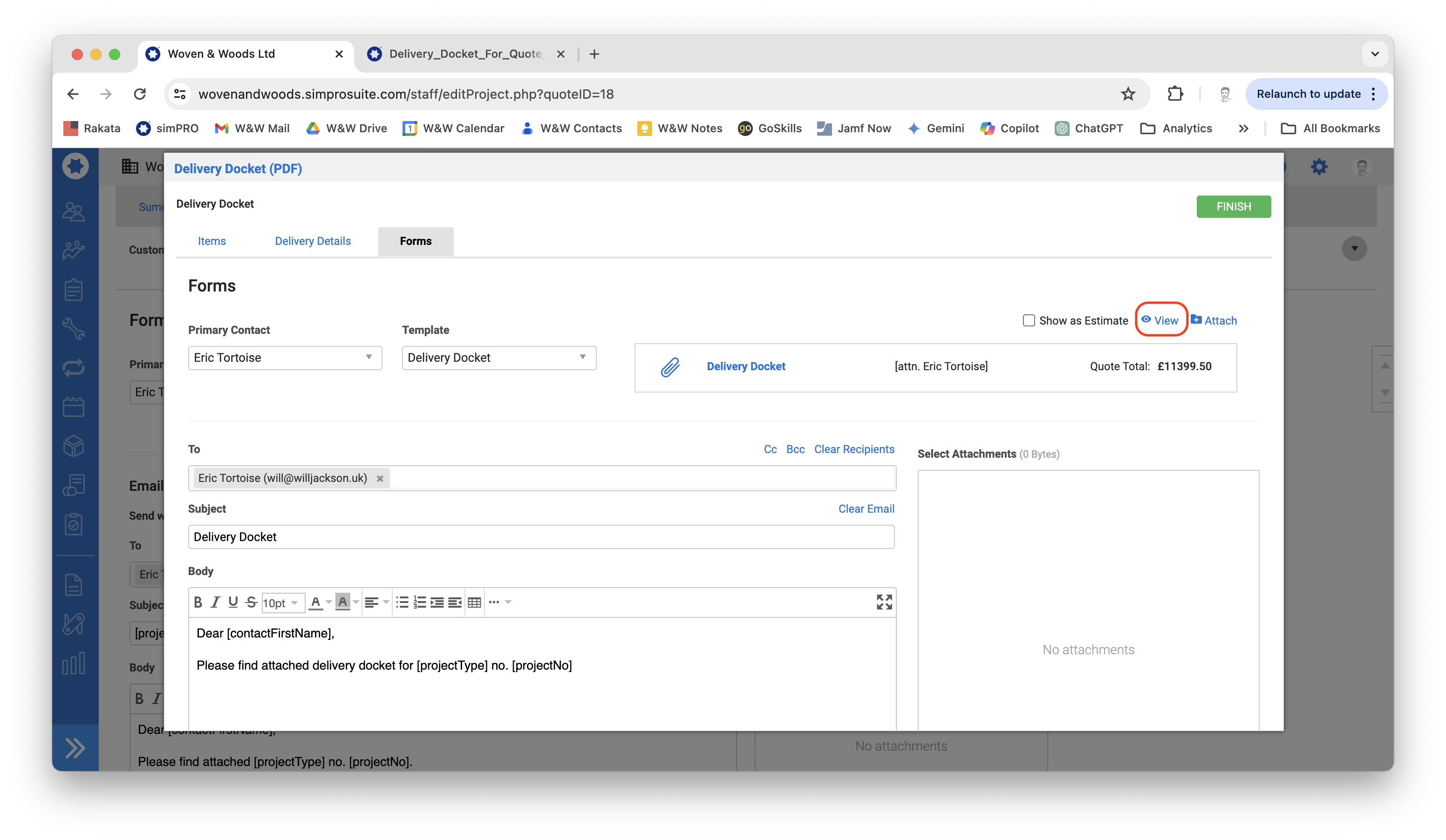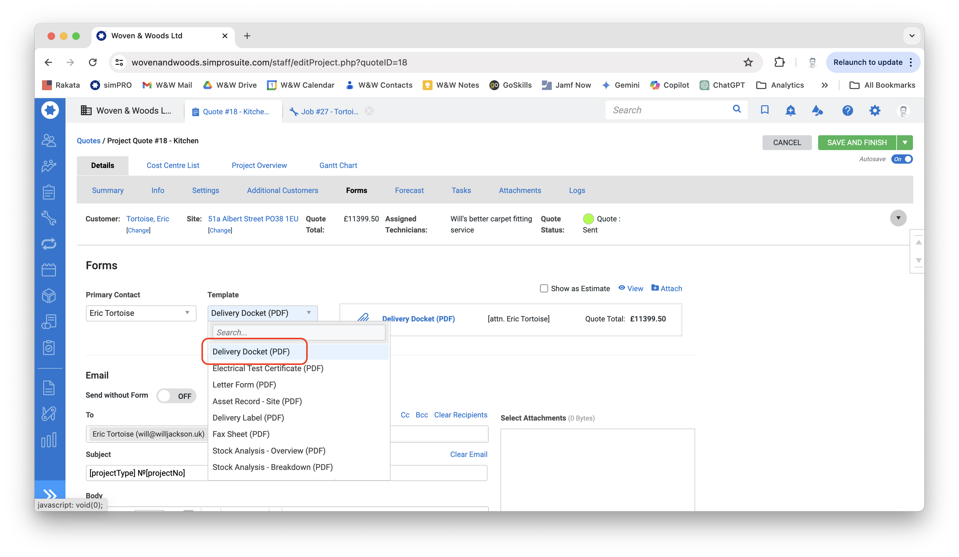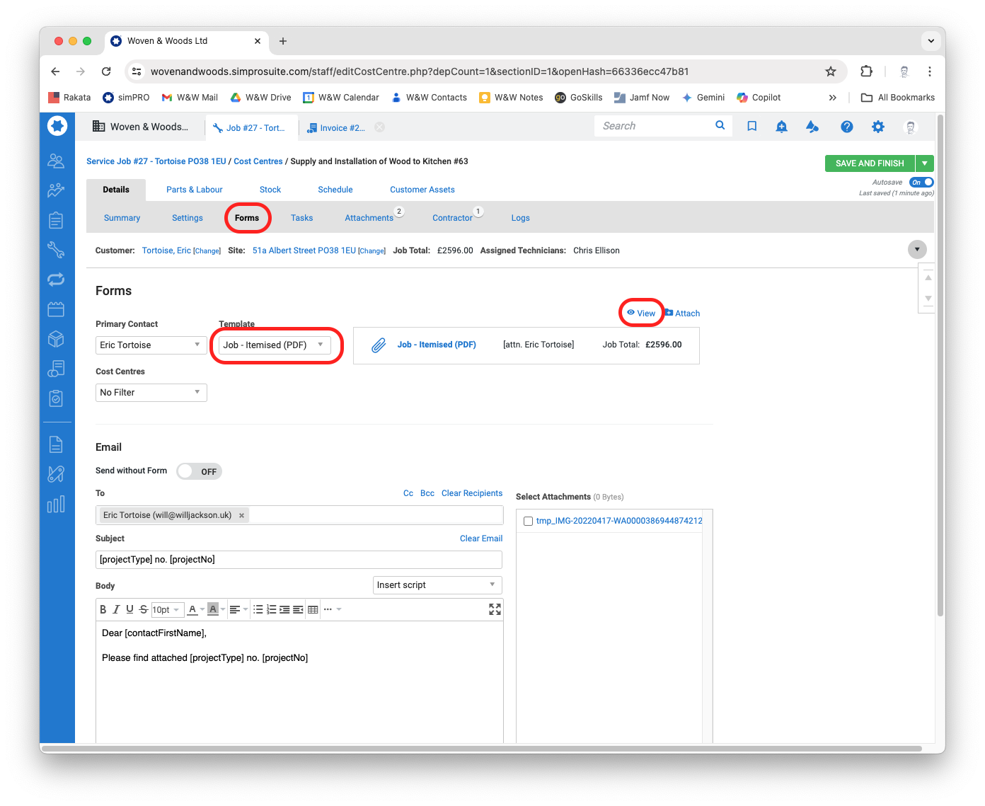 - When simPRO has finished processing the document, scroll to the bottom of the Forms page to generate the email to the customer. All details should be automatically inserted, so you generally won’t need to do anything here. Anything in