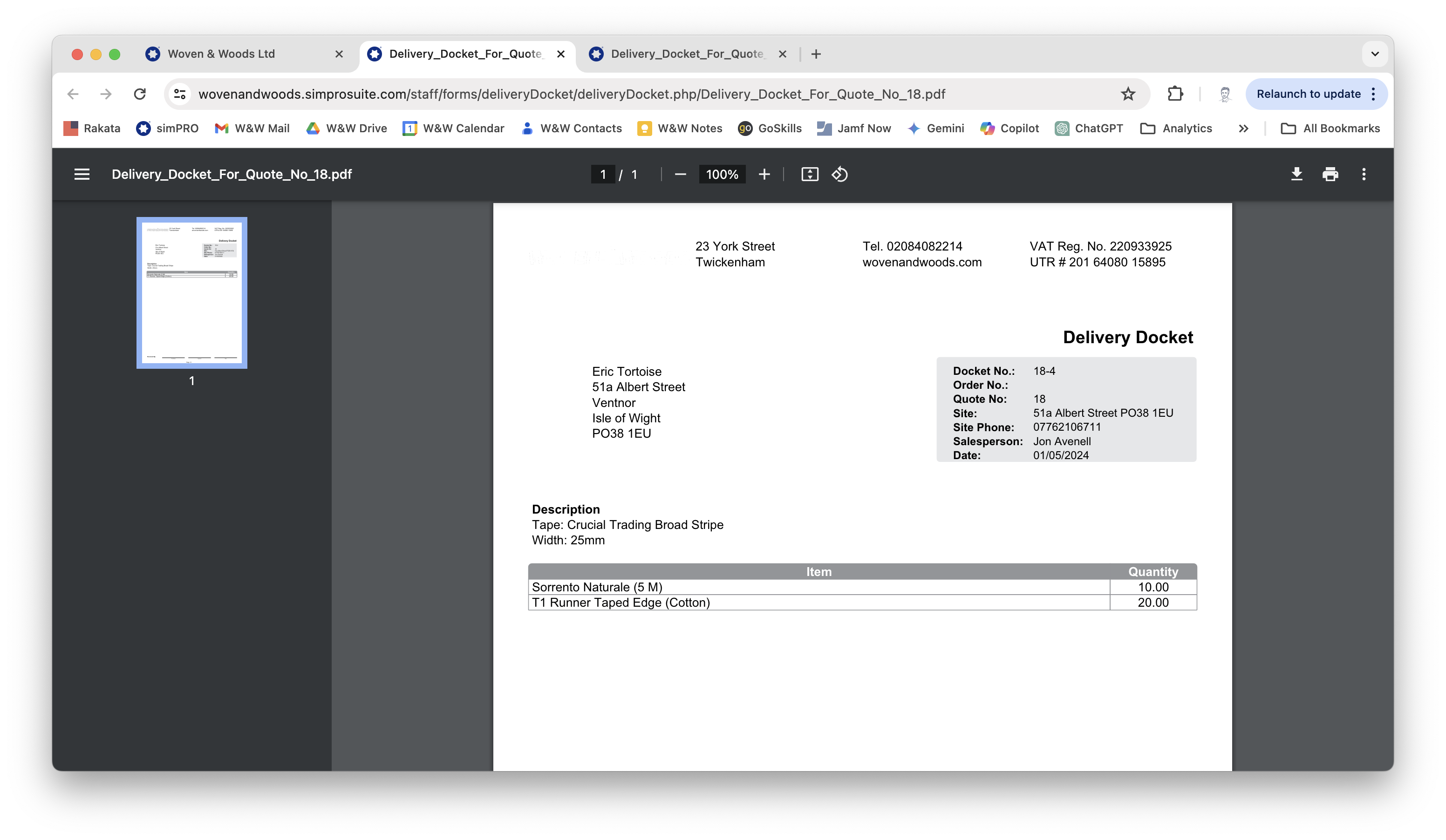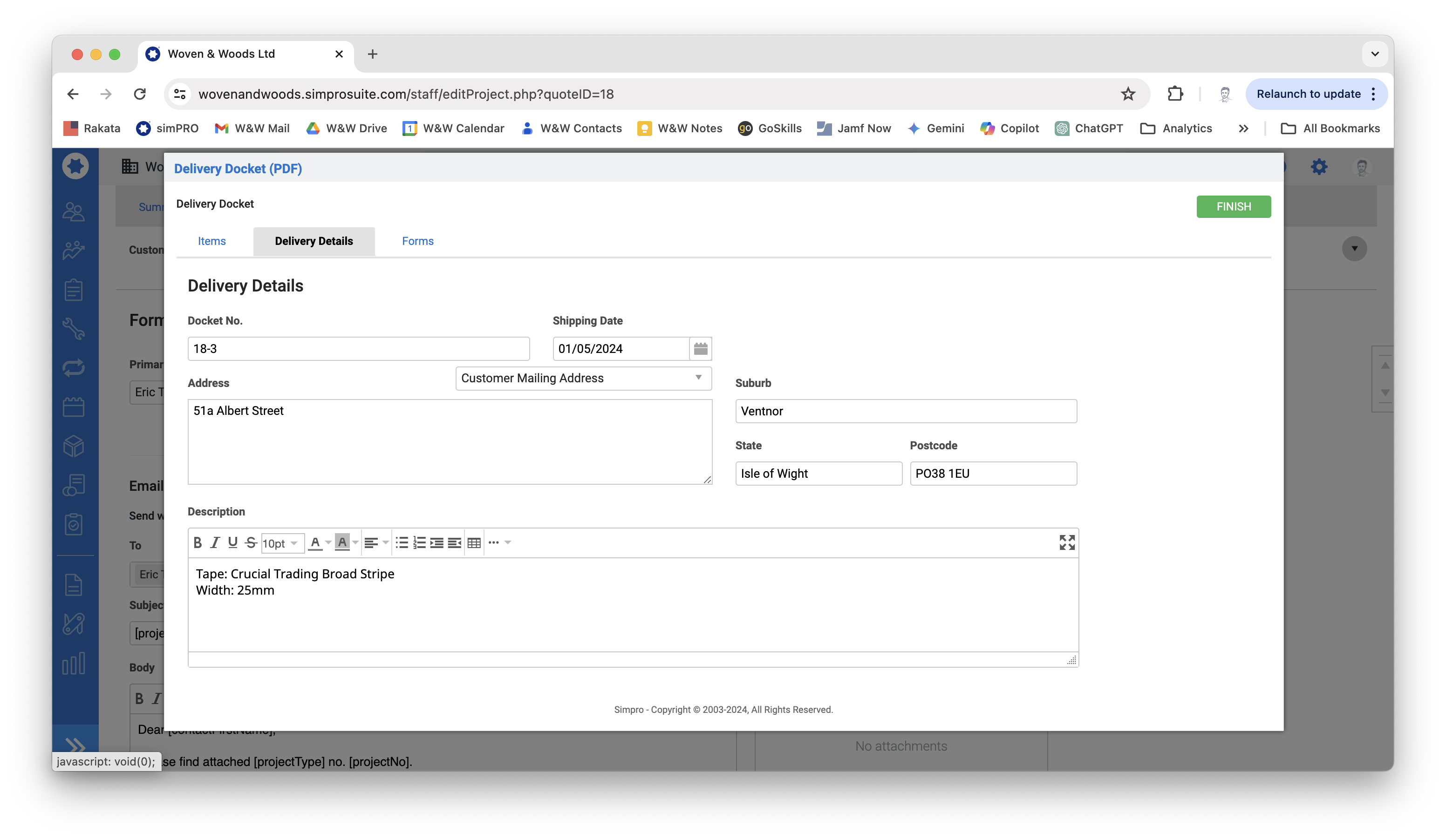 Section titled “Create a Delivery Docket (Taping or Whipping)”If the job involves a custom taped or whipped rug or runner, you will need to raise a delivery docket for the finishing company.