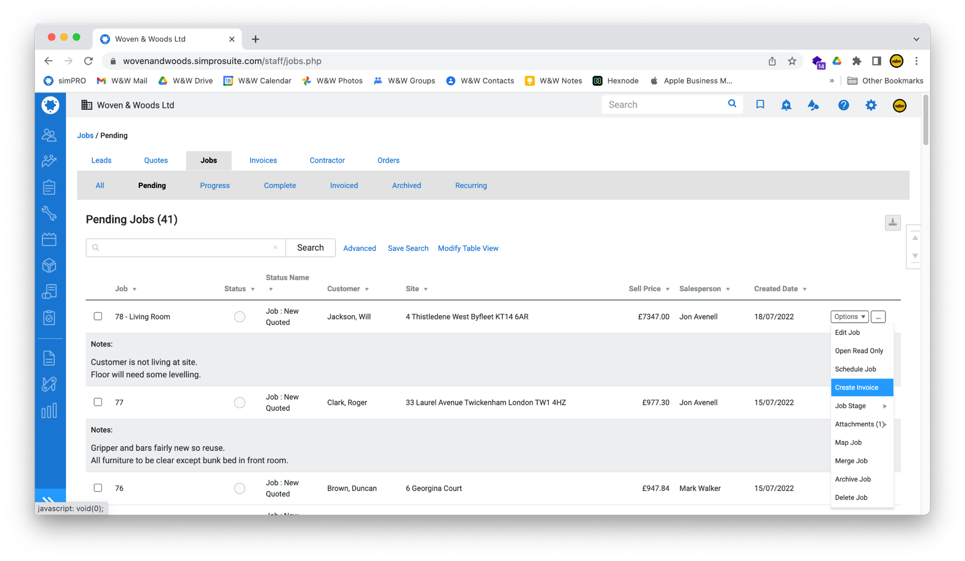 Section titled “Raise Deposit Invoice”- To raise a new deposit invoice, use the blue bar on the left-hand side of the screen to navigate to Jobs > Pending Jobs.
