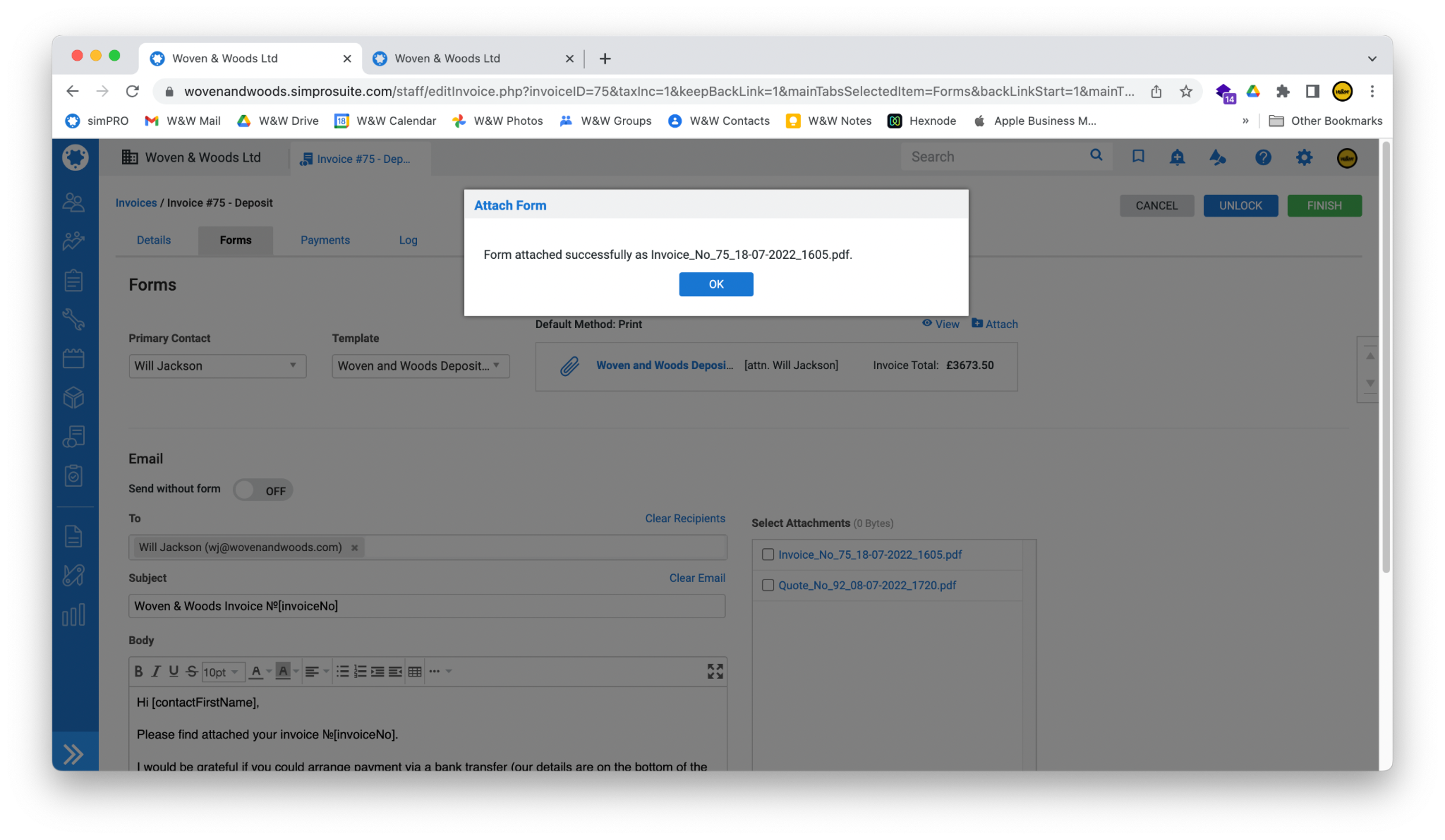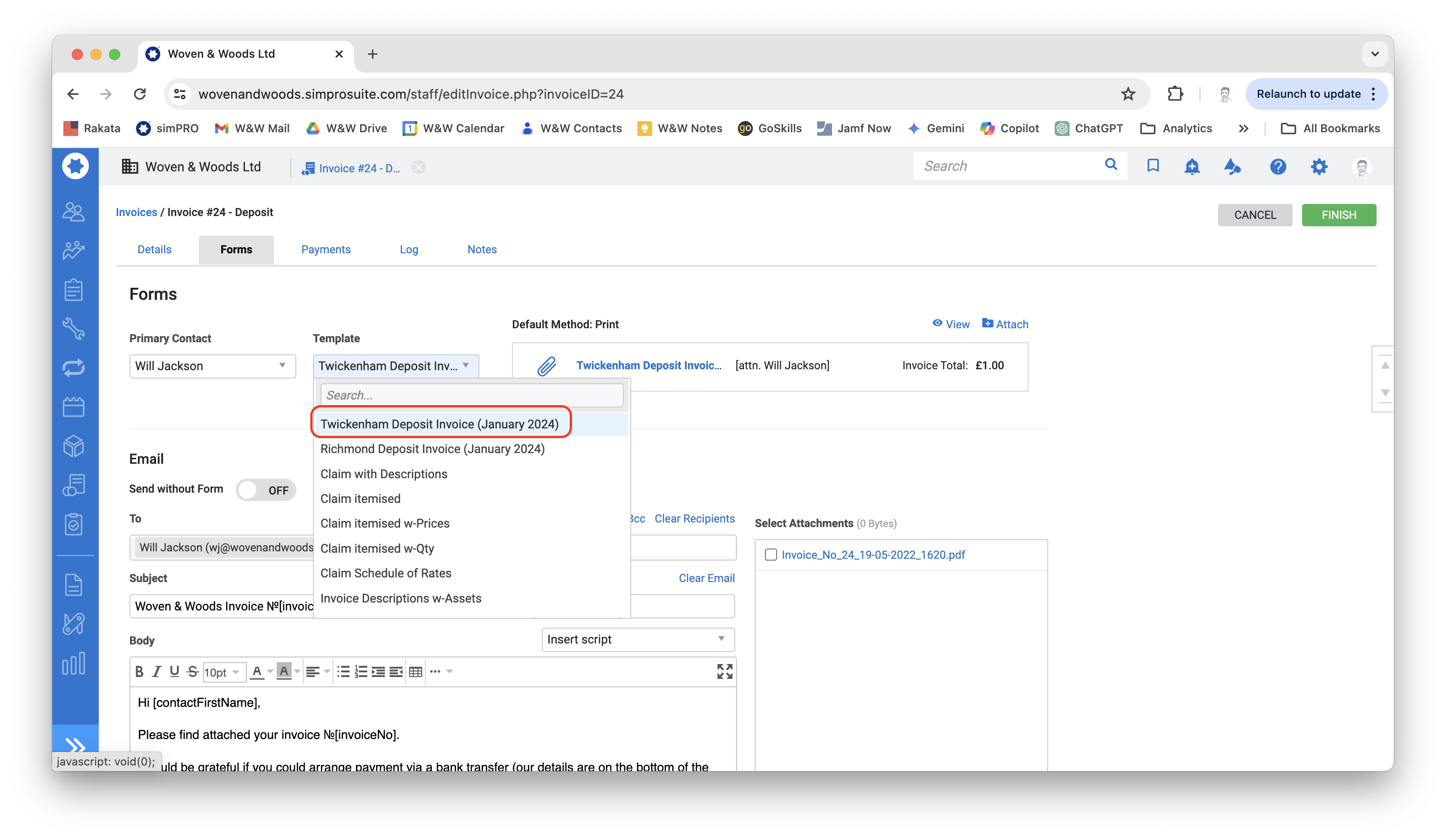 - When you are back on the Forms page, click the Attach link next to the blue folder icon to convert the invoice to PDF and prepare the email to the customer.