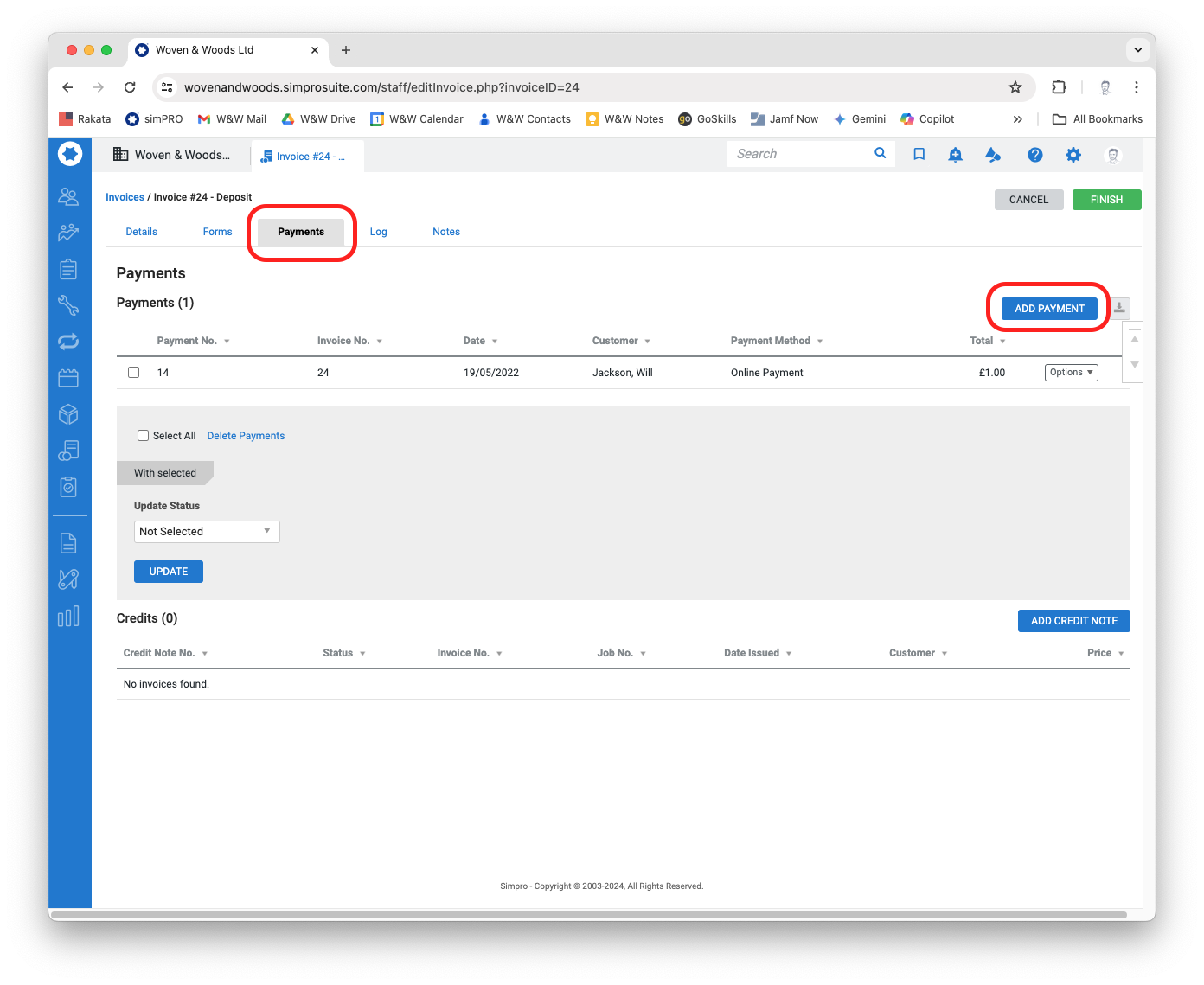 To assign a payment, open the relevant invoice in simPRO and click the Payments tab, followed by the Add Payment button.