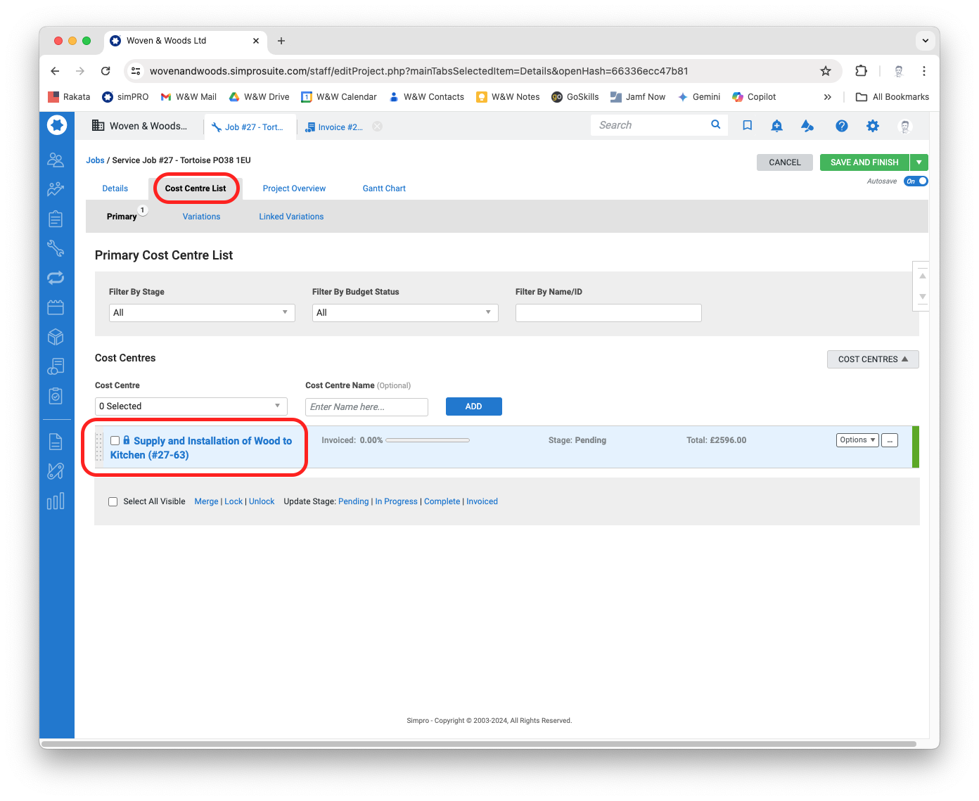 Section titled “Raise a Work Order”- With the job page open in simPRO, select the Cost Centre List tab and then click on the relevant cost centre.