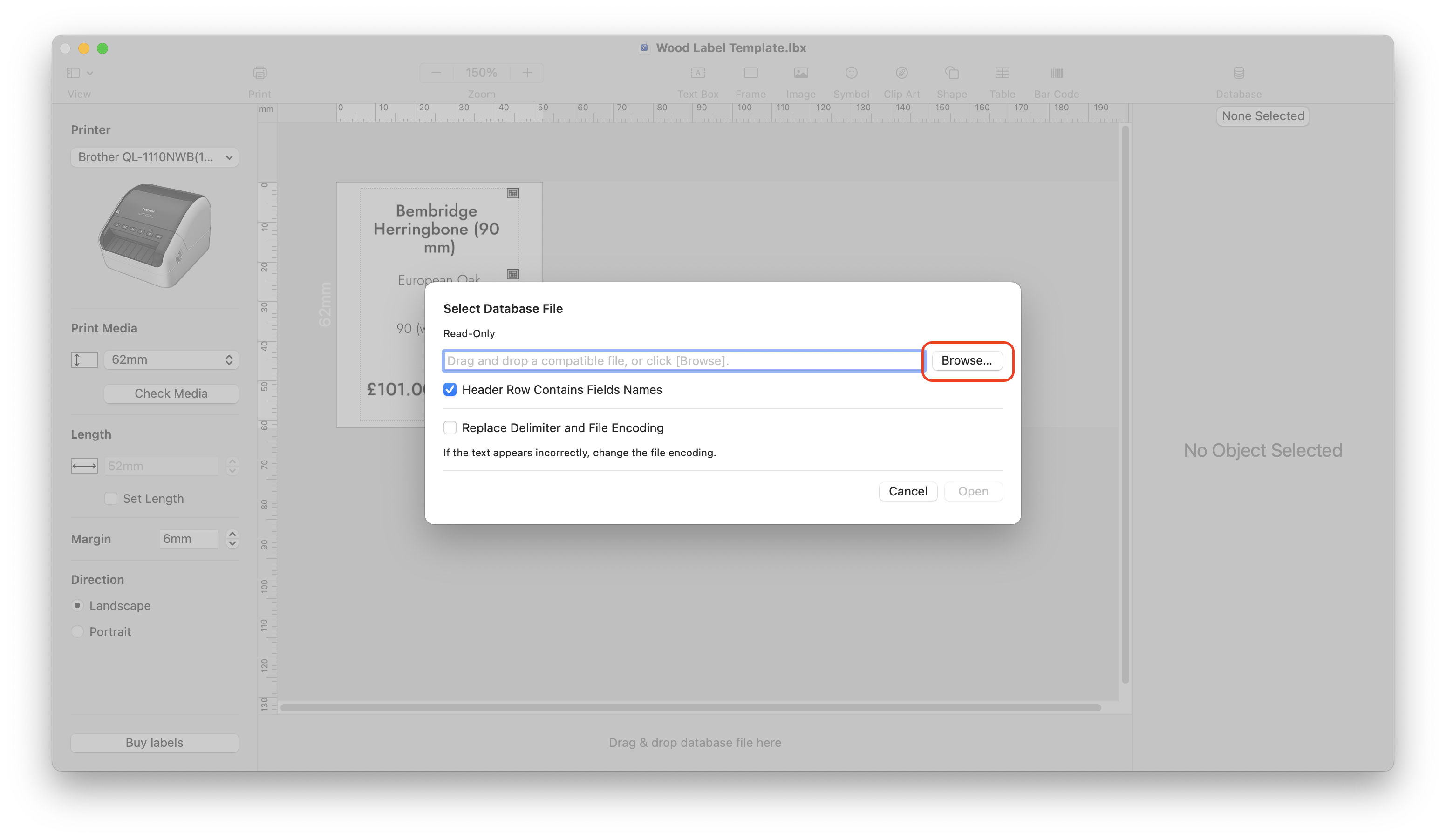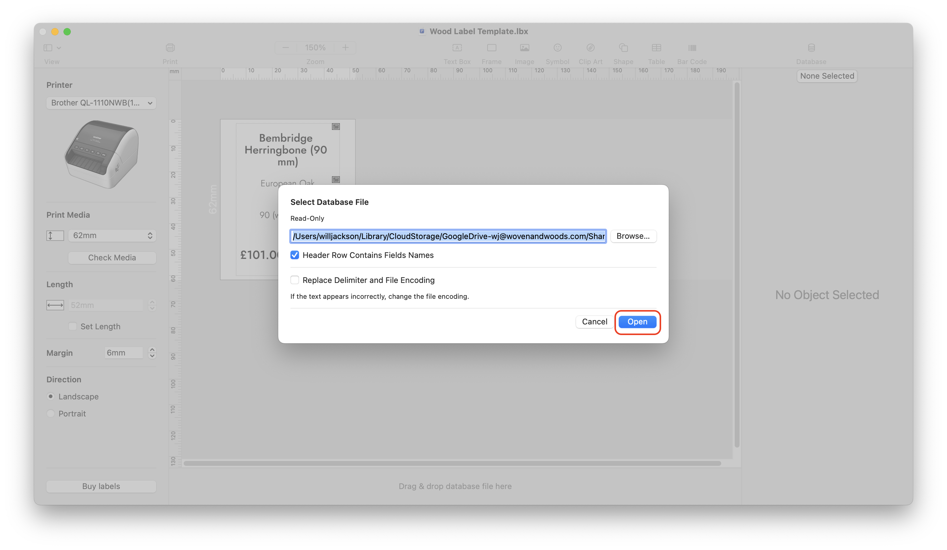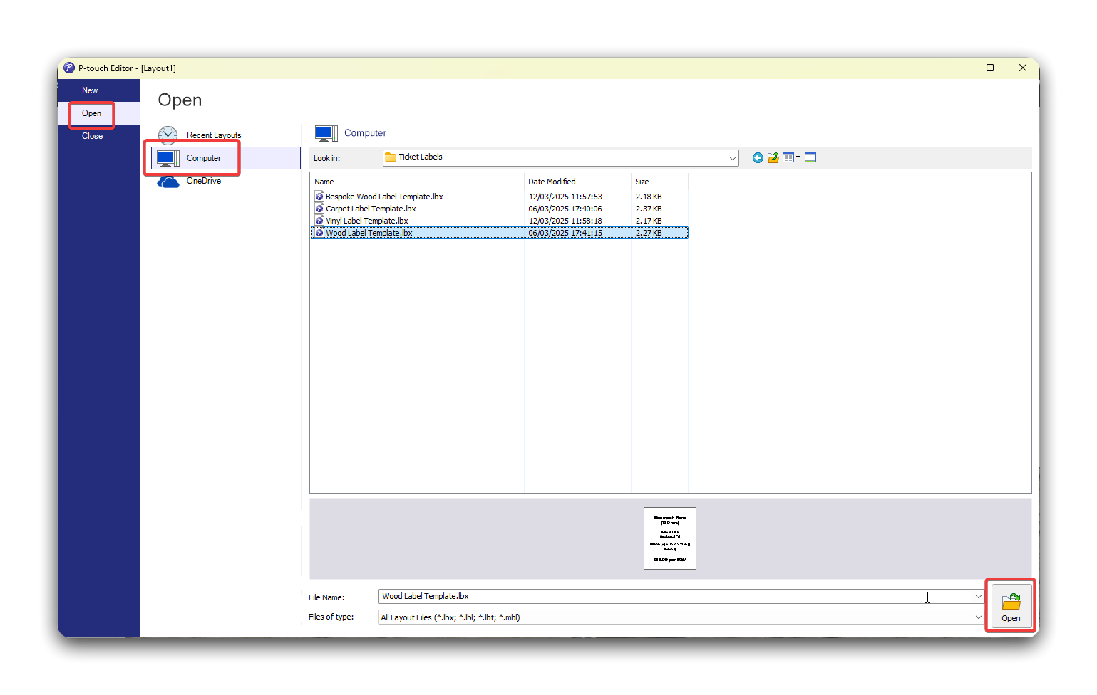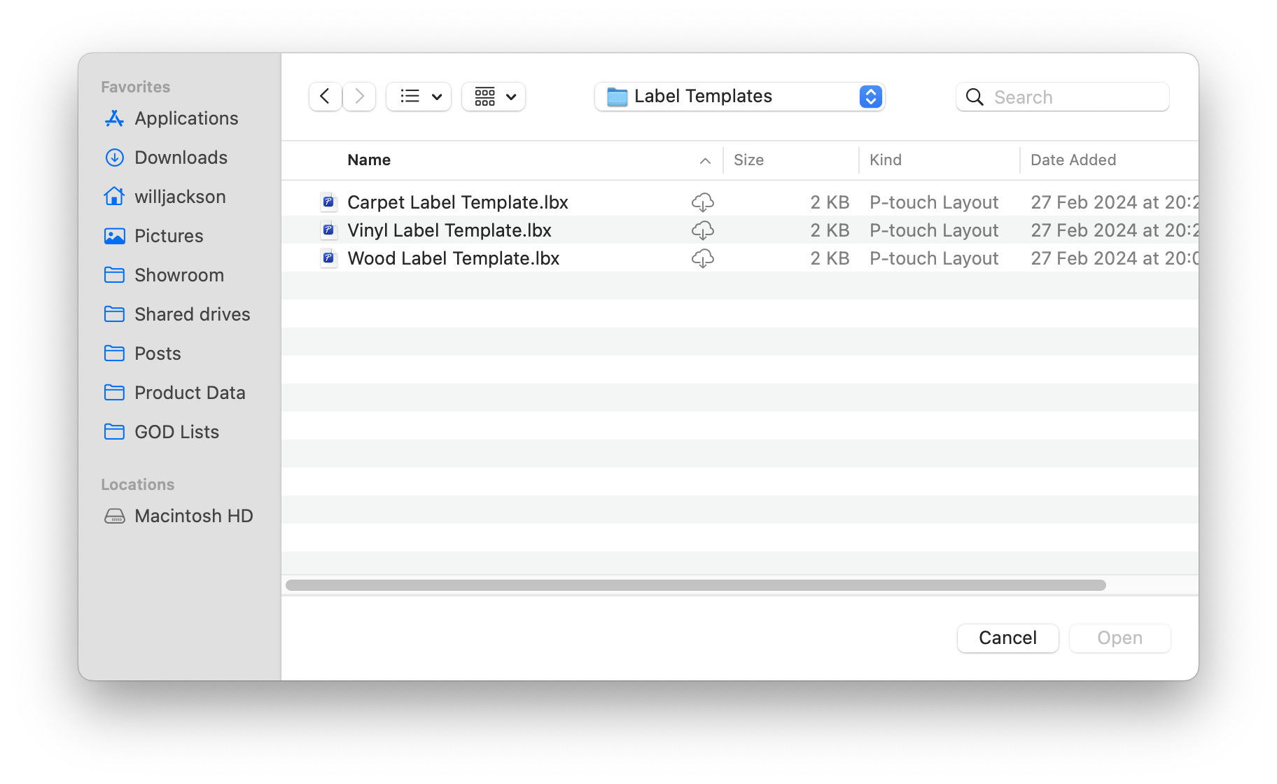 Google Drive/Shared Drives/Showroom/Tickets & Labels/Label Templates. Then select the relevant template and click Open.