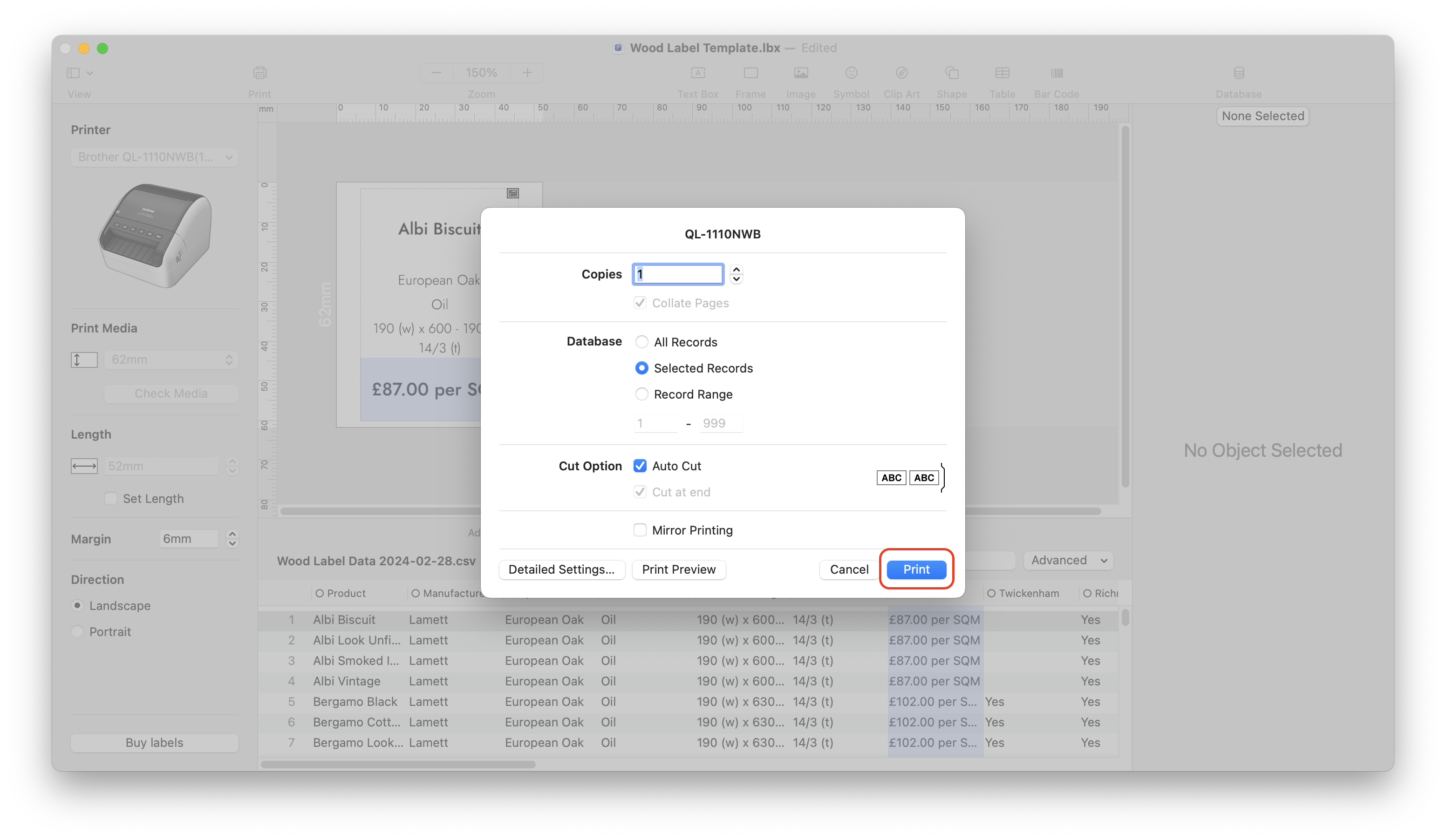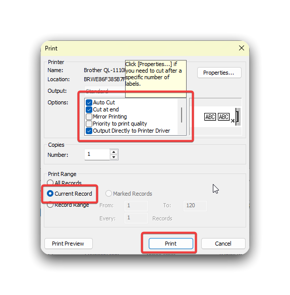 - This will open the Print dialogue box. Make sure that Auto Cut and Selected Records are selected, and click the Print button.