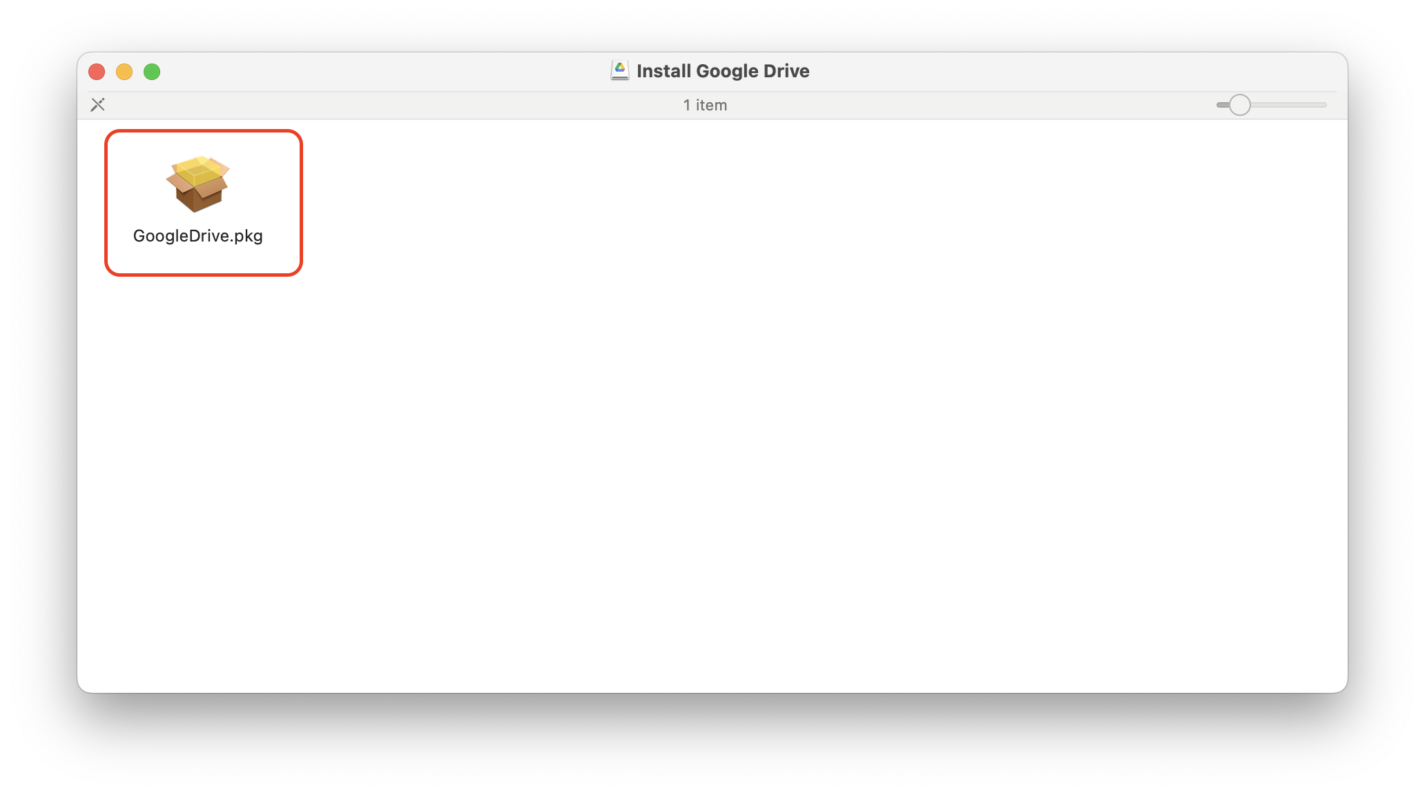 - A new Finder window will open with the installer file in it. Double click GoogleDrive.pkg to begin the installation.