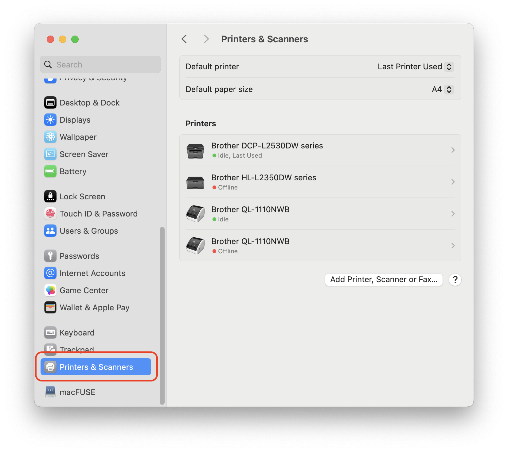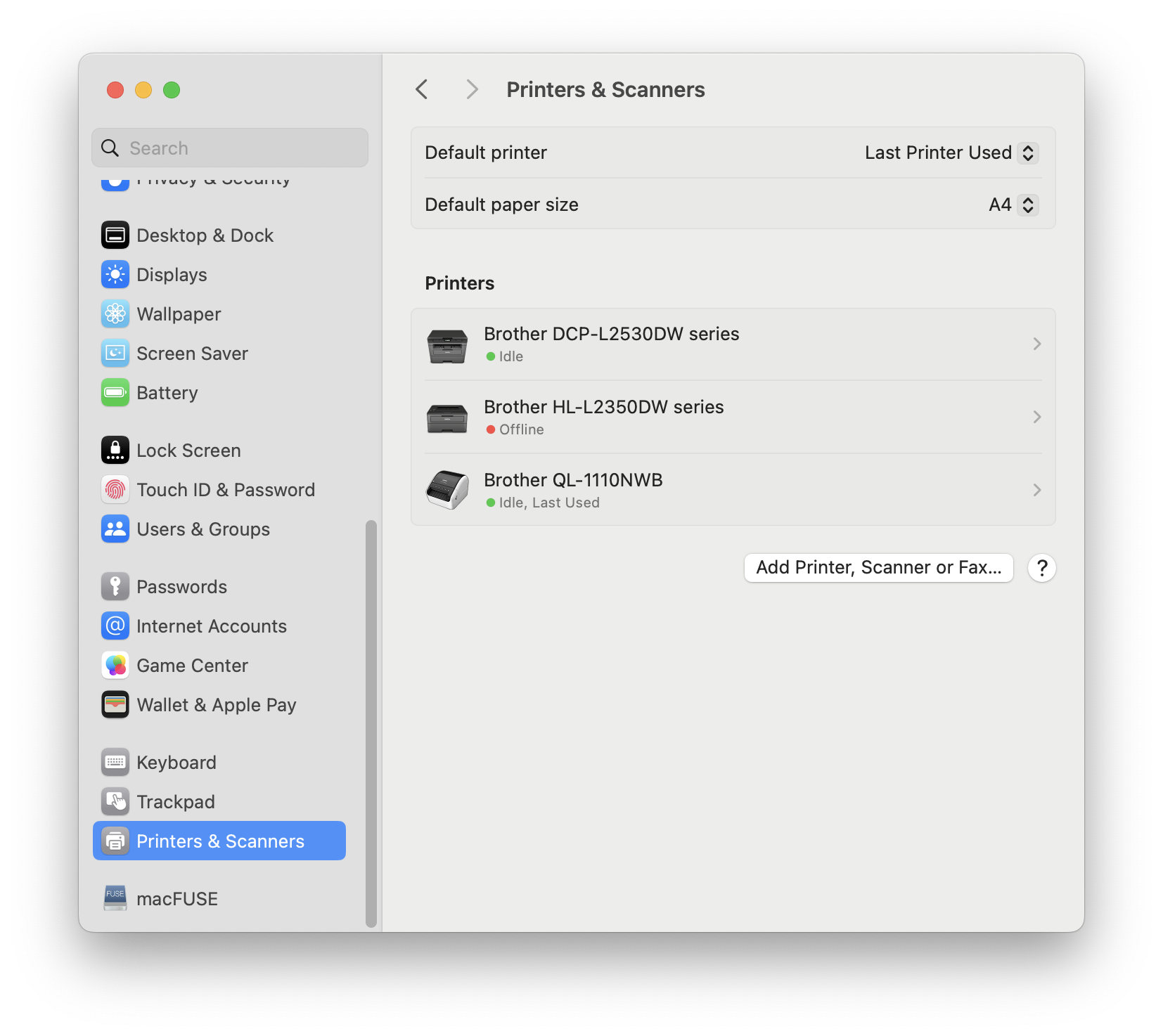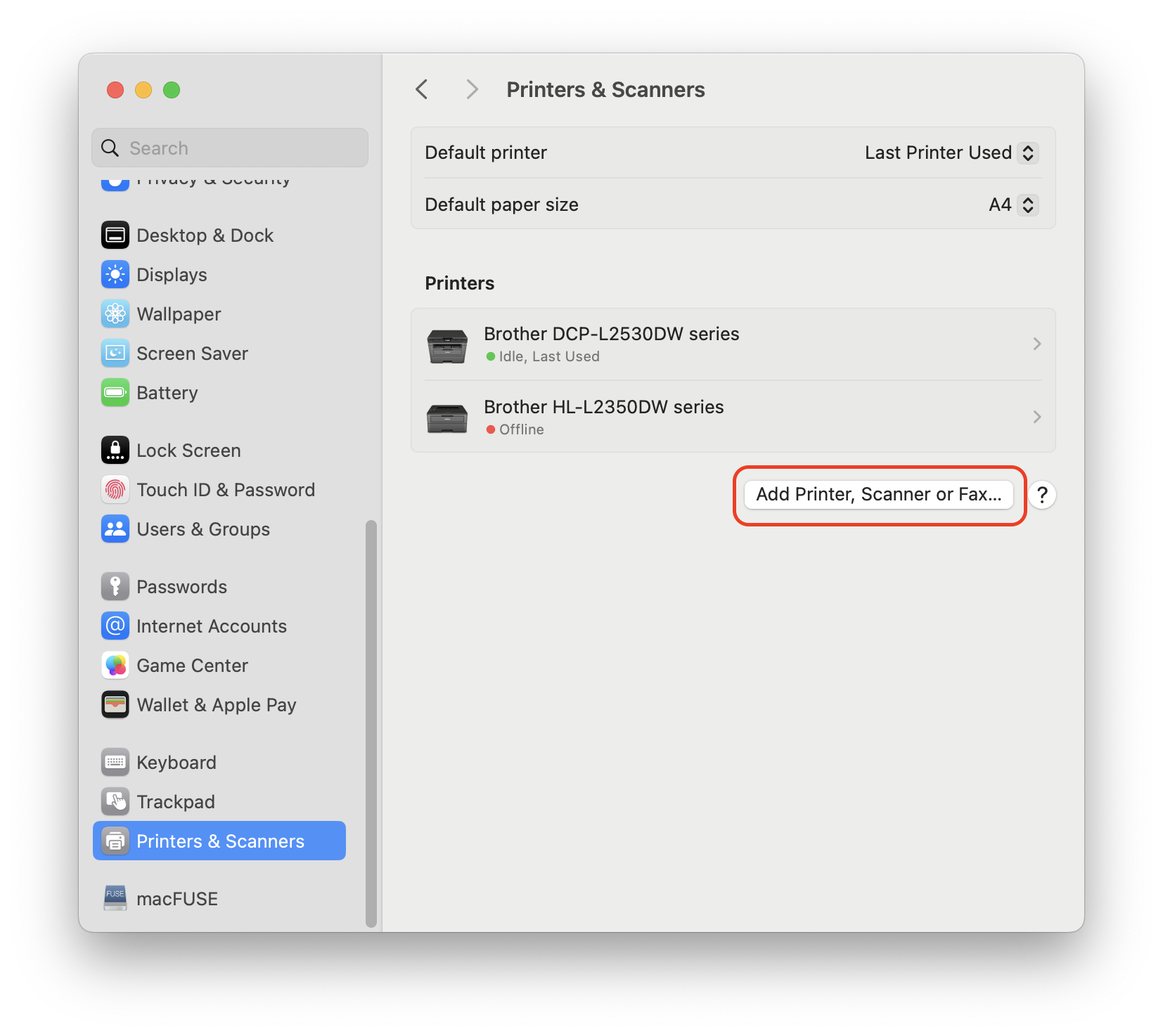 - Click the Add Printer, Scanner or Fax… button.