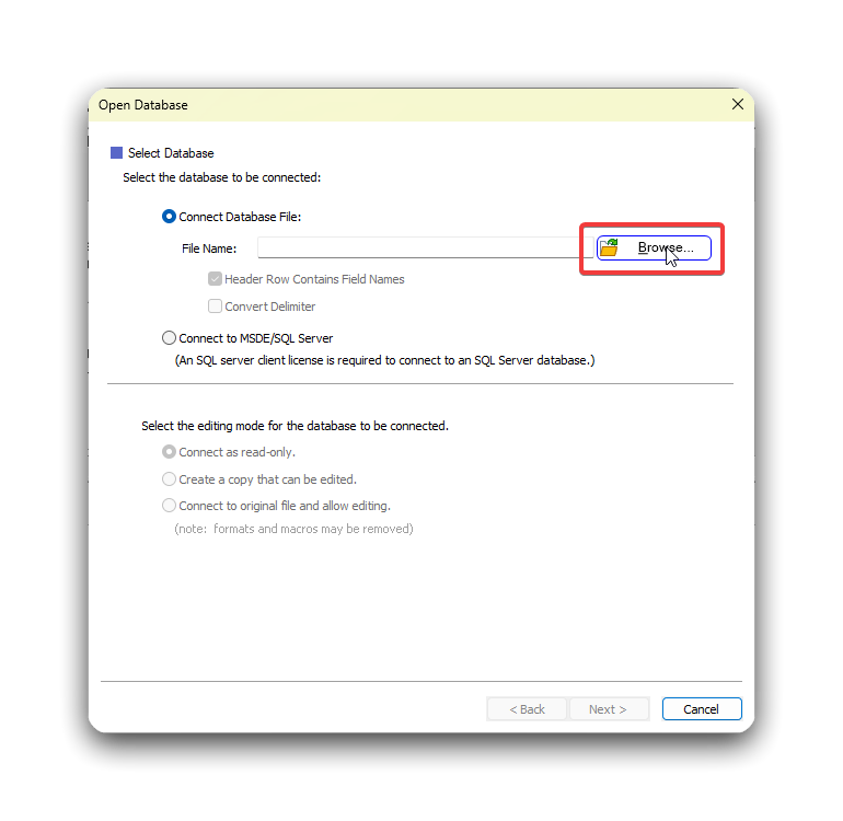 - When the window opens, make sure the box next to Select Database is selected and click Browse….