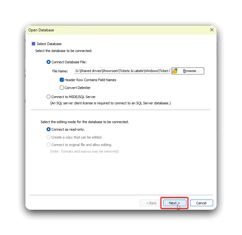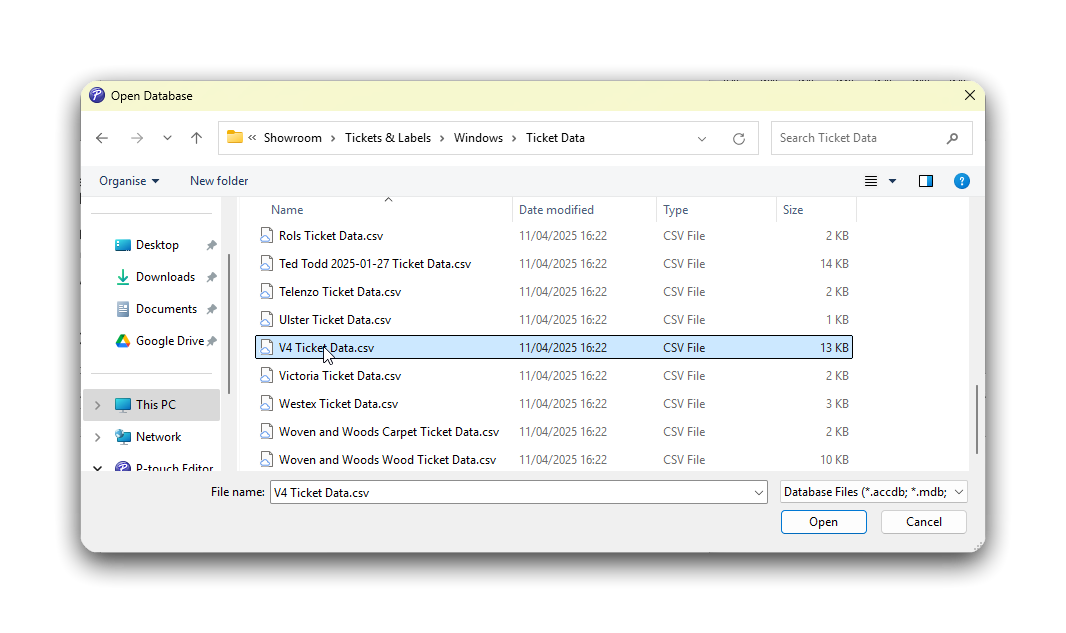 Google Drive/Showroom/Tickets & Data/Windows/Ticket Dataand select the database you need. Then click Open.