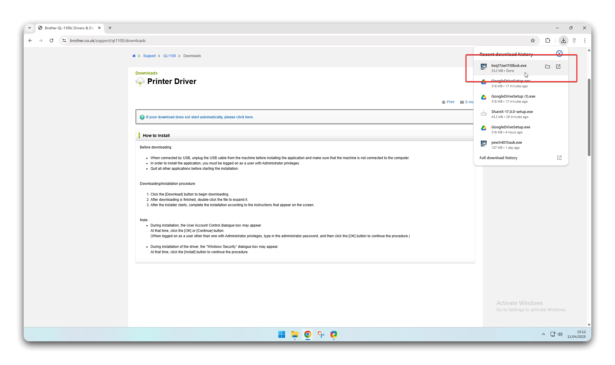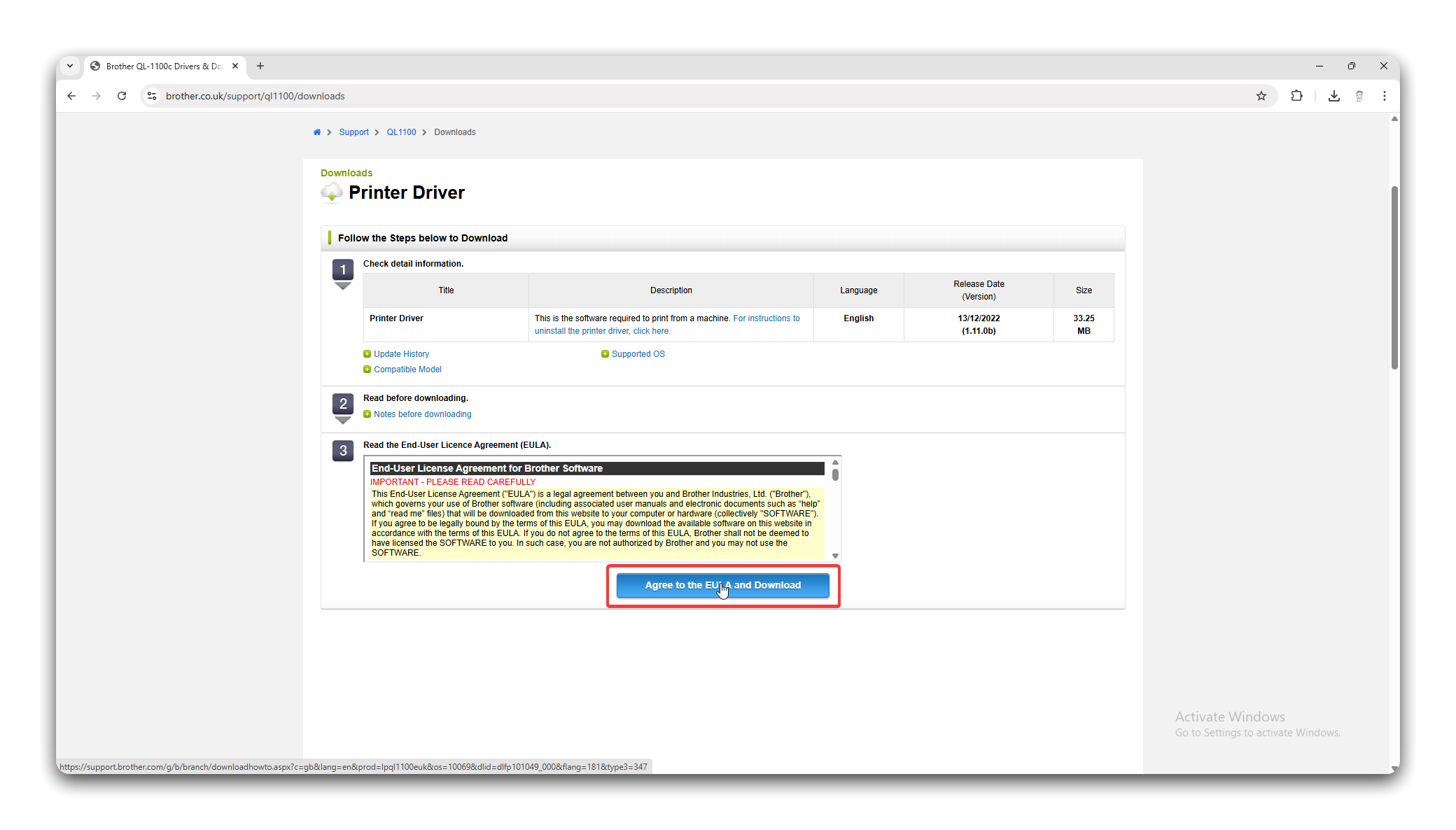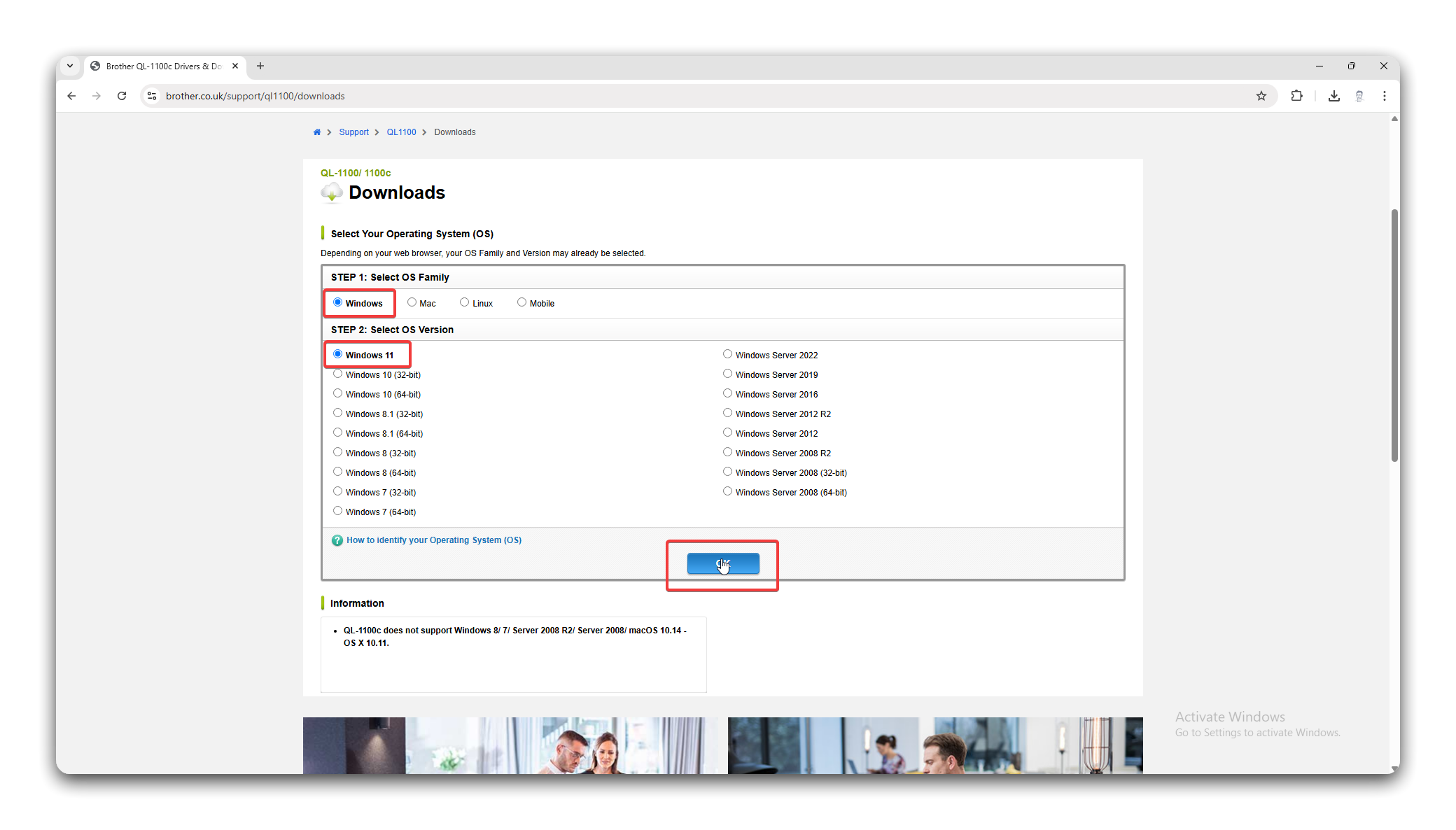 Section titled “Install the Label Printer”- Navigate to https://www.brother.co.uk/support/ql1100/downloads, scroll down and select the relevant operating system. This will usually be Windows 11. When done, click OK.