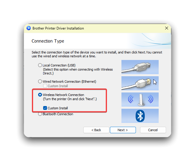 - Select the option that says Wireless Network Connection and then check the box that says Custom Install. Make sure both options are selected, or the installation will fail.
