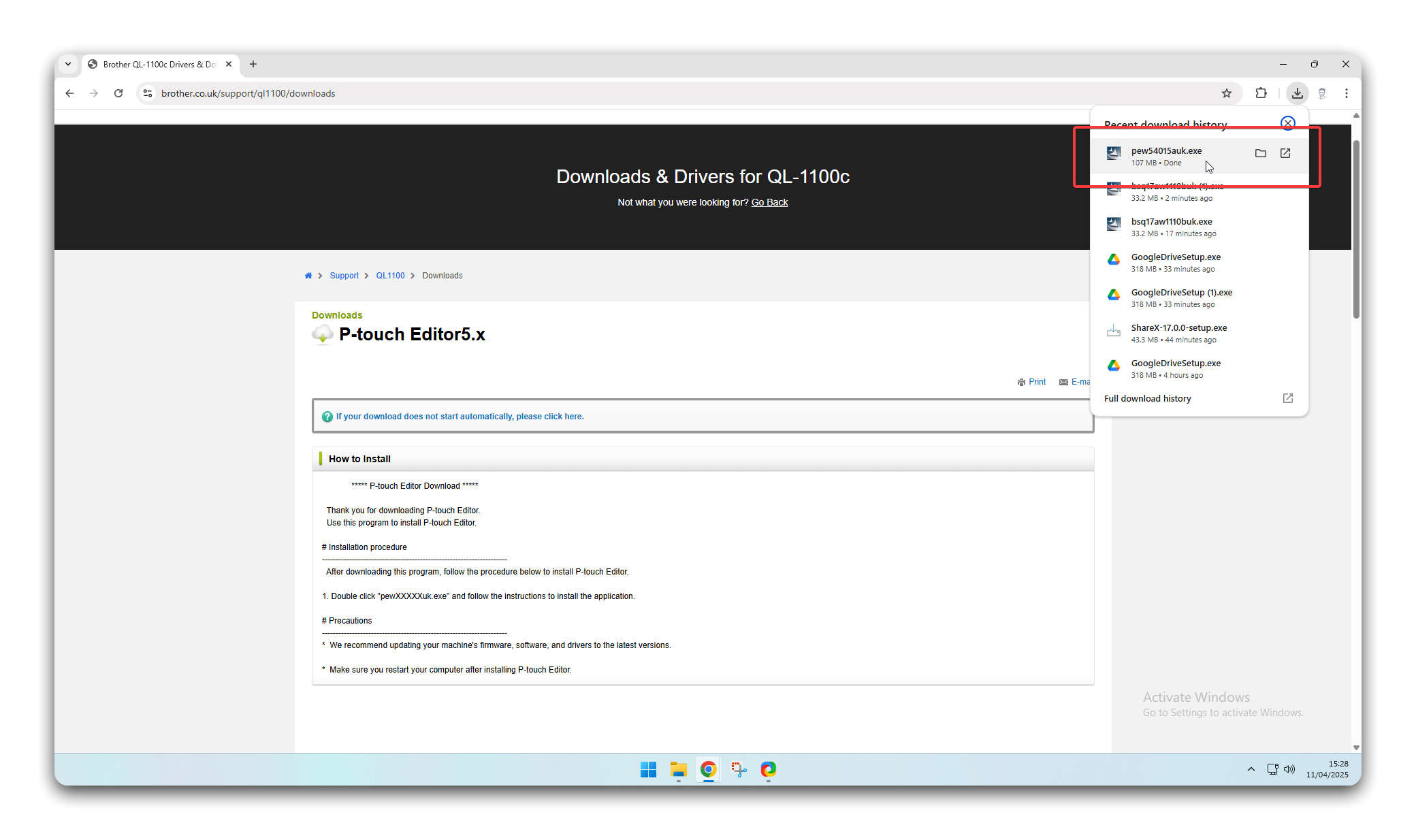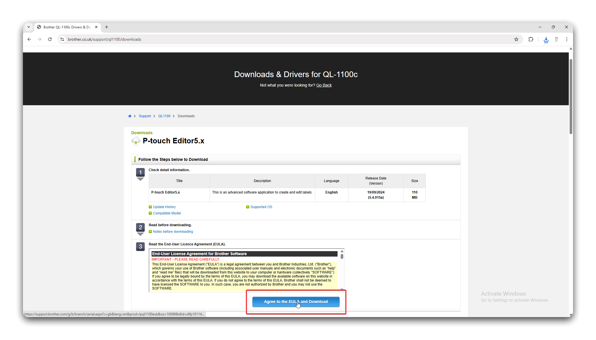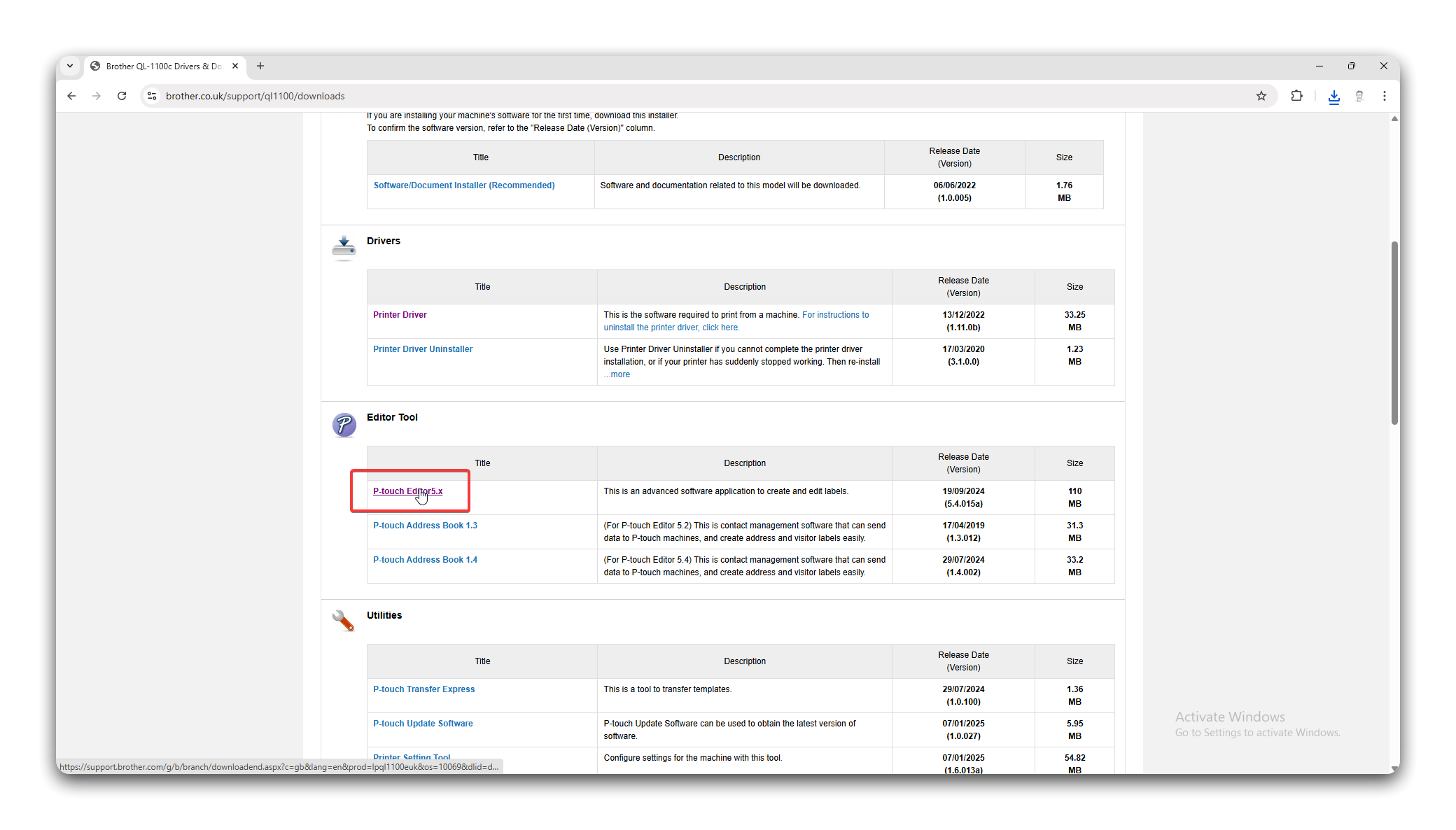 Section titled “Install the Brother P-Touch Software”- Navigate to https://www.brother.co.uk/support/ql1100/downloads, scroll down and select the relevant operating system. This will usually be Windows 11. When done, click OK.